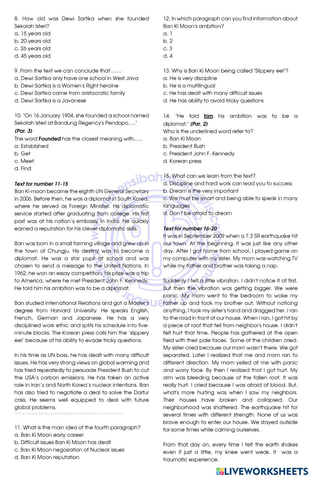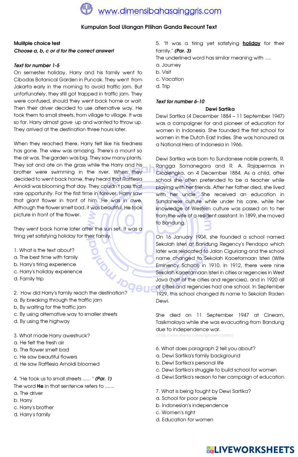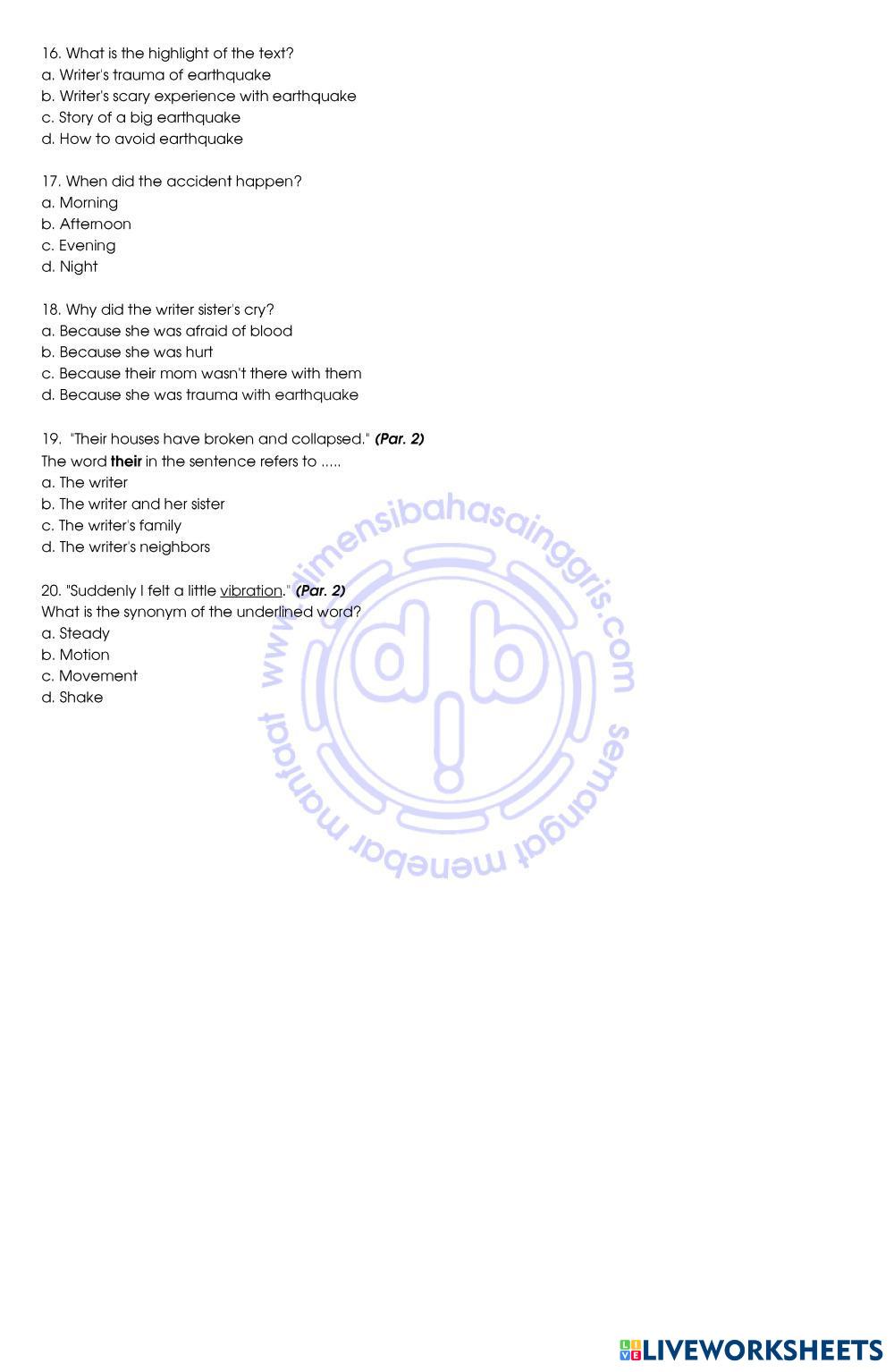 Created byPuji Kurniawati English language Reading comprehension Age 10+ level: 8th grade English Author's Instructions My Google Classroom Courses × 0 classes selected (0 students total) Quick Access Select all classes (0 classes) All Classes Loading courses... Cancel Share Share to selected Course __COURSE_NAME__ __STUDENT_NAME__ (__STUDENT_EMAIL__) SUMATIF TEST FOR RECOUNT TEXT Download Worksheet Validation Check my answers Emails my answers to my teacher Full name Group/level School subject Teacher's email or key code Close Submit Validating worksheet... (12) Your answers have been sent to your teacher. Good luck! OK We encountered an error submitting your answers. Please try again. OK Advertisement | Go Ad Free Created byPuji Kurniawati English language Reading comprehension Age 10+ level: 8th grade English Author's Instructions