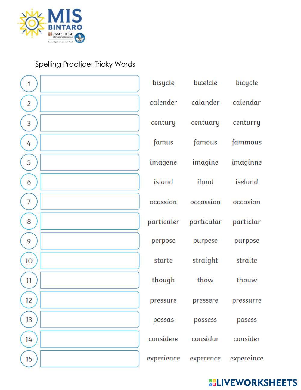 Created byPatricia Habala English language Speling Age 8-13 level: Grade 3 and 4 English Author's Instructions My Google Classroom Courses × 0 classes selected (0 students total) Quick Access Select all classes (0 classes) All Classes Loading courses... Cancel Share Share to selected Course __COURSE_NAME__ __STUDENT_NAME__ (__STUDENT_EMAIL__) Spelling Practice: Tricky Words Download Worksheet Validation Check my answers Emails my answers to my teacher Full name Group/level School subject Teacher's email or key code Close Submit Validating worksheet... (12) Your answers have been sent to your teacher. Good luck! OK We encountered an error submitting your answers. Please try again. OK Advertisement | Go Ad Free Created byPatricia Habala English language Speling Age 8-13 level: Grade 3 and 4 English Author's Instructions