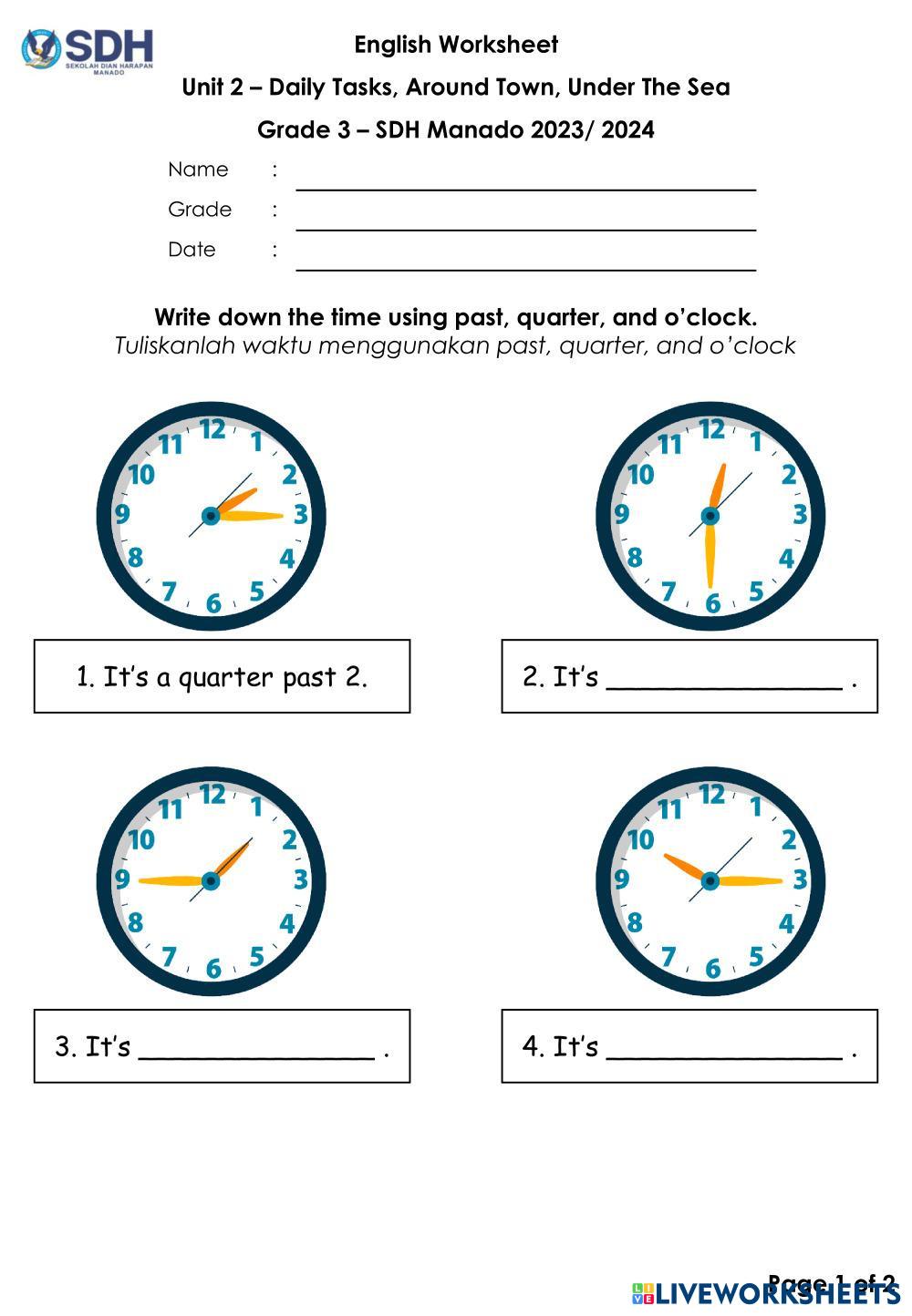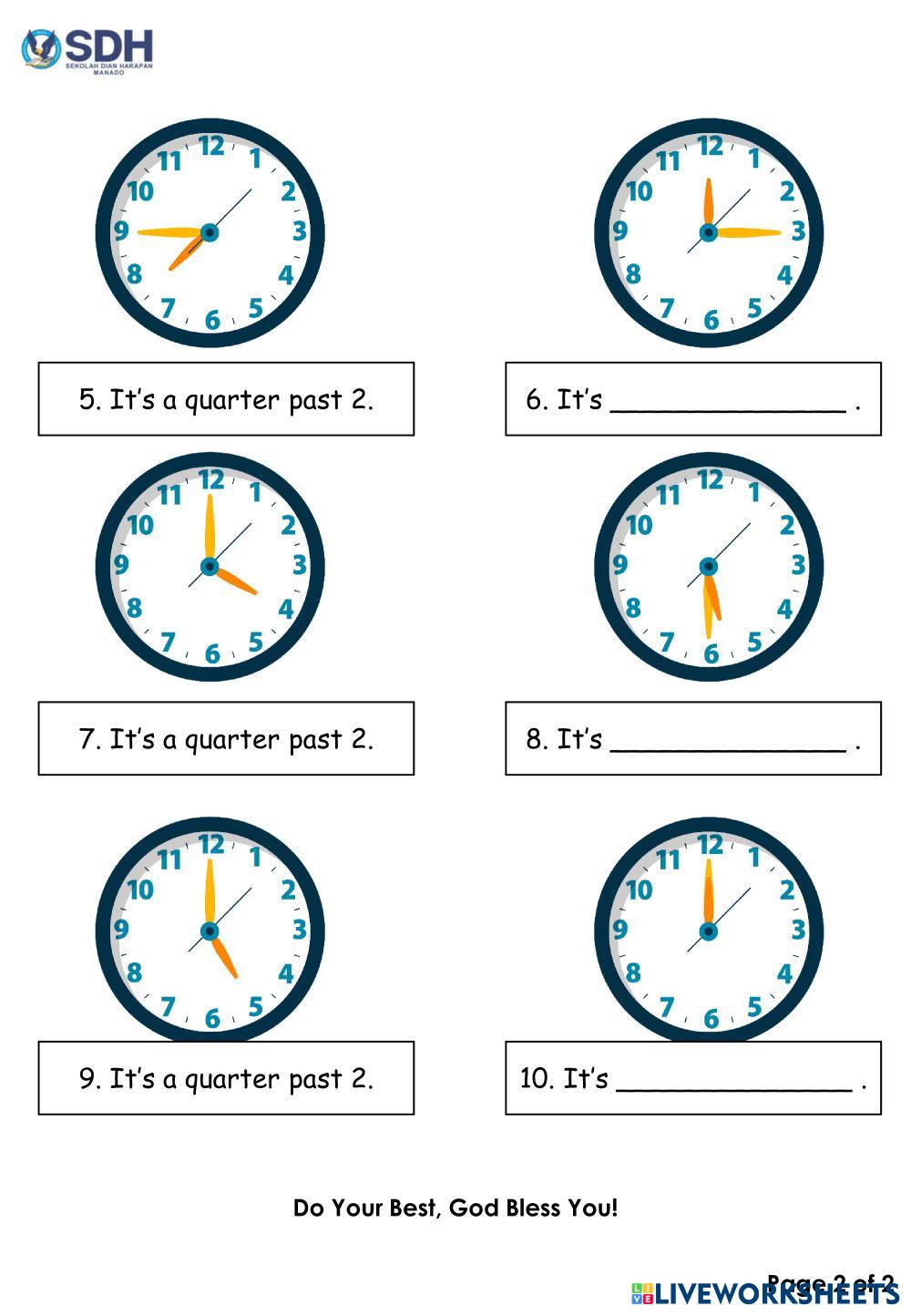 Created byApriyanti Monalisa English Language Quarer to, Quarter past, Half past, O'clock Age 9-13 level: Grade 3 English Author's Instructions My Google Classroom Courses × 0 classes selected (0 students total) Quick Access Select all classes (0 classes) All Classes Loading courses... Cancel Share Share to selected Course __COURSE_NAME__ __STUDENT_NAME__ (__STUDENT_EMAIL__) Reading Time Download Worksheet Validation Check my answers Emails my answers to my teacher Full name Group/level School subject Teacher's email or key code Close Submit Validating worksheet... (12) Your answers have been sent to your teacher. Good luck! OK We encountered an error submitting your answers. Please try again. OK Advertisement | Go Ad Free Created byApriyanti Monalisa English Language Quarer to, Quarter past, Half past, O'clock Age 9-13 level: Grade 3 English Author's Instructions