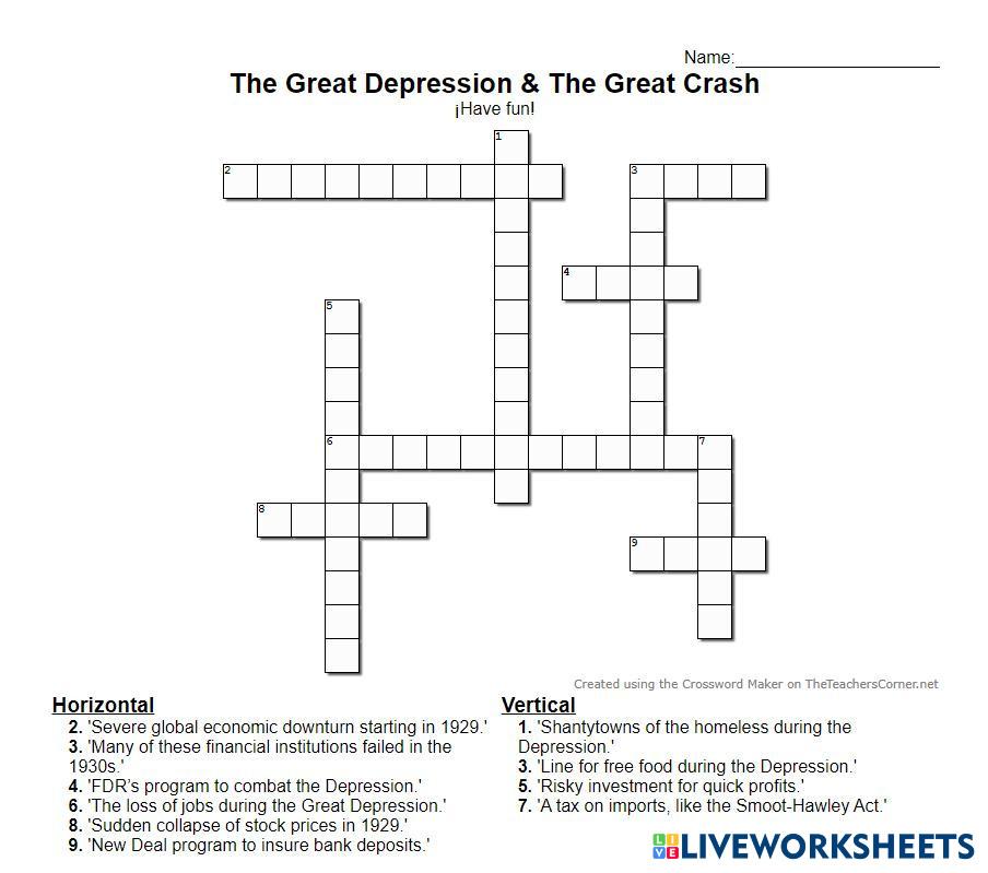 Created byJuan Otoya English language The Great Depression & The Great Crash Age 15+ level: B1 - 2 English Author's Instructions My Google Classroom Courses × 0 classes selected (0 students total) Quick Access Select all classes (0 classes) All Classes Loading courses... Cancel Share Share to selected Course __COURSE_NAME__ __STUDENT_NAME__ (__STUDENT_EMAIL__) The Great Crash & The Great Depression Download Worksheet Validation Check my answers Emails my answers to my teacher Full name Group/level School subject Teacher's email or key code Close Submit Validating worksheet... (12) Your answers have been sent to your teacher. Good luck! OK We encountered an error submitting your answers. Please try again. OK Advertisement | Go Ad Free Created byJuan Otoya English language The Great Depression & The Great Crash Age 15+ level: B1 - 2 English Author's Instructions