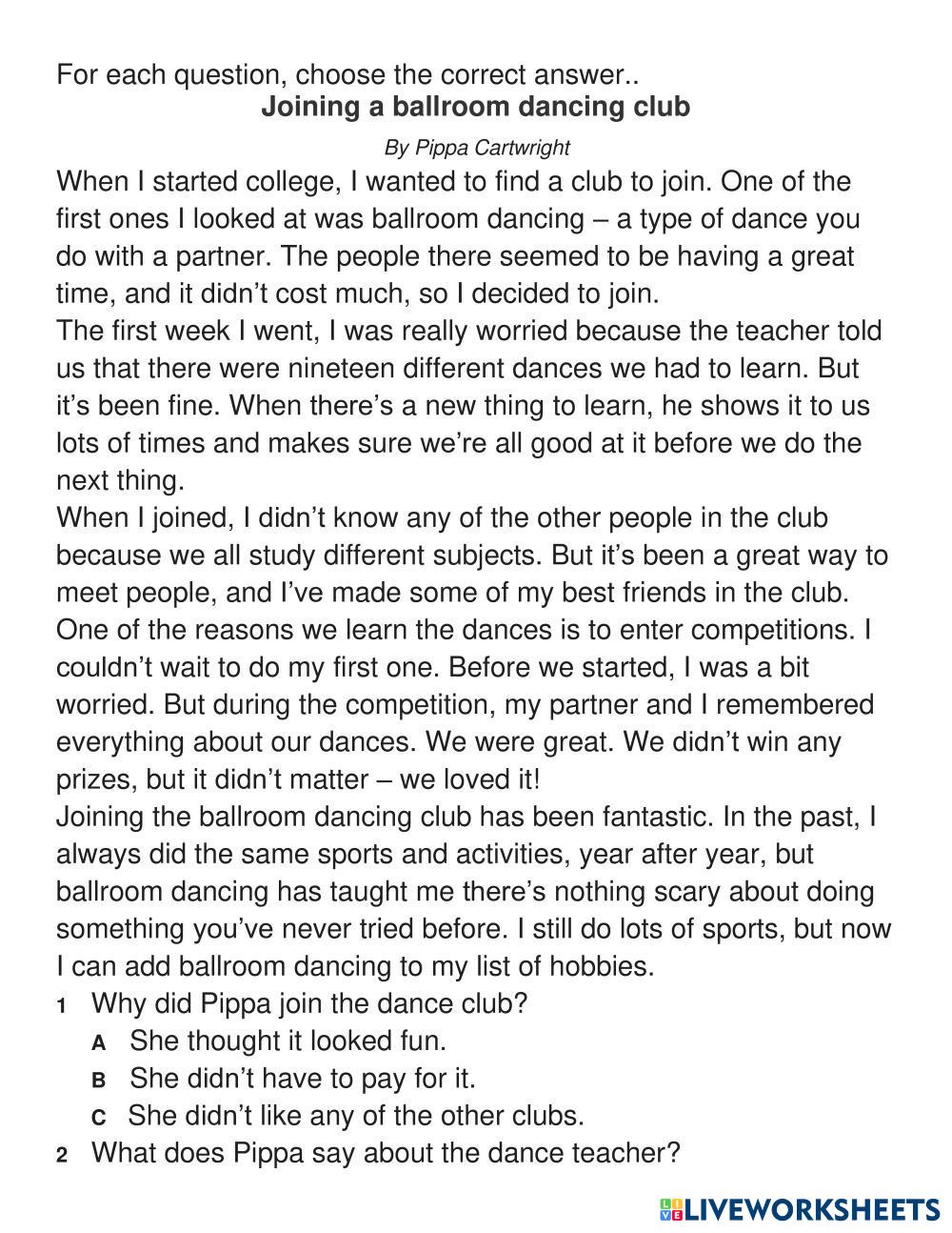 Created byTA Day Kem - A2 English language Joe Brown being a writer Age 12-15 level: 6-8 English Author's Instructions My Google Classroom Courses × 0 classes selected (0 students total) Quick Access Select all classes (0 classes) All Classes Loading courses... Cancel Share Share to selected Course __COURSE_NAME__ __STUDENT_NAME__ (__STUDENT_EMAIL__) Joining a ballroom dancing club – A2 English Reading Test Download Worksheet Validation Check my answers Emails my answers to my teacher Full name Group/level School subject Teacher's email or key code Close Submit Validating worksheet... (12) Your answers have been sent to your teacher. Good luck! OK We encountered an error submitting your answers. Please try again. OK Advertisement | Go Ad Free Created byTA Day Kem - A2 English language Joe Brown being a writer Age 12-15 level: 6-8 English Author's Instructions