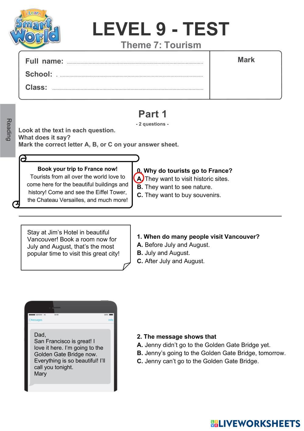 Created byTA Day Kem - B1 English language Grammar Age 10+ level: 9 English Author's Instructions My Google Classroom Courses × 0 classes selected (0 students total) Quick Access Select all classes (0 classes) All Classes Loading courses... Cancel Share Share to selected Course __COURSE_NAME__ __STUDENT_NAME__ (__STUDENT_EMAIL__) SW09Theme07-R&W Download Worksheet Validation Check my answers Emails my answers to my teacher Full name Group/level School subject Teacher's email or key code Close Submit Validating worksheet... (12) Your answers have been sent to your teacher. Good luck! OK We encountered an error submitting your answers. Please try again. OK Advertisement | Go Ad Free Created byTA Day Kem - B1 English language Grammar Age 10+ level: 9 English Author's Instructions