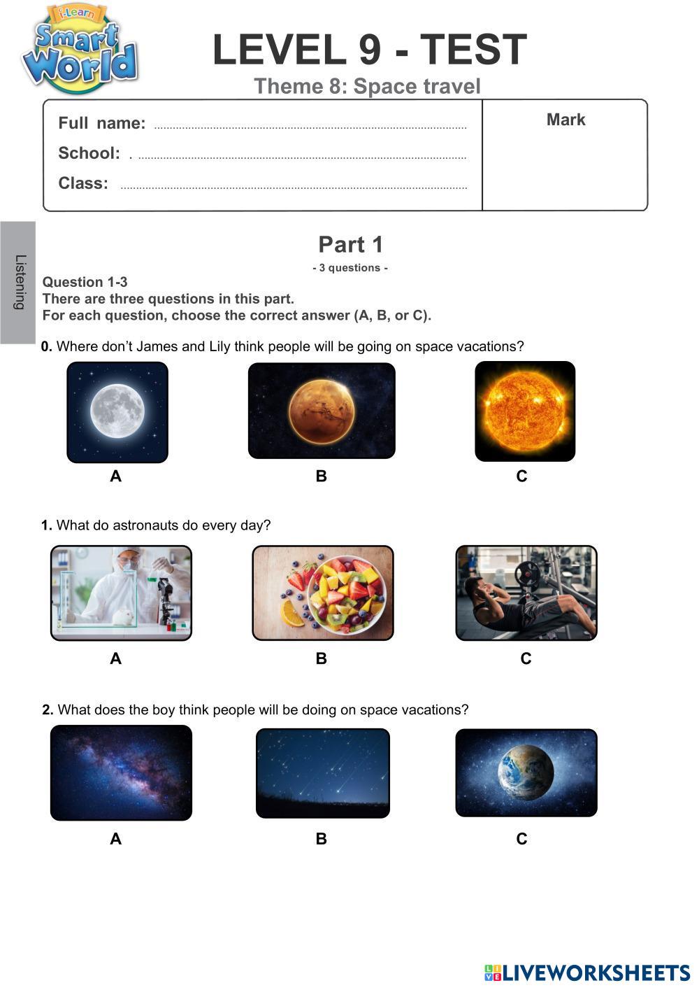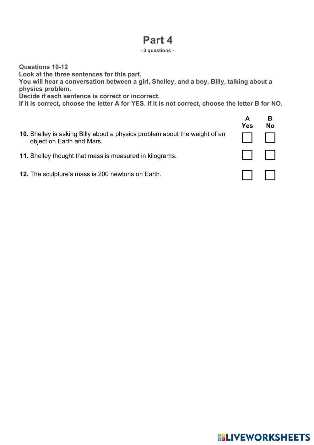 Created byTA Day Kem - B1 English language Grammar Age 9+ level: 9 English Author's Instructions My Google Classroom Courses × 0 classes selected (0 students total) Quick Access Select all classes (0 classes) All Classes Loading courses... Cancel Share Share to selected Course __COURSE_NAME__ __STUDENT_NAME__ (__STUDENT_EMAIL__) SW09Theme08-Listening Download Worksheet Validation Check my answers Emails my answers to my teacher Full name Group/level School subject Teacher's email or key code Close Submit Validating worksheet... (12) Your answers have been sent to your teacher. Good luck! OK We encountered an error submitting your answers. Please try again. OK Advertisement | Go Ad Free Created byTA Day Kem - B1 English language Grammar Age 9+ level: 9 English Author's Instructions
