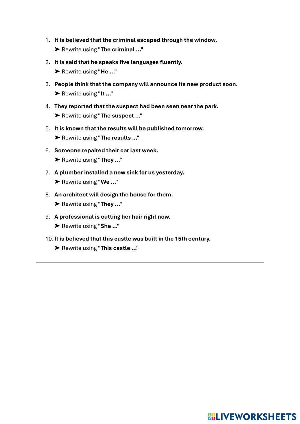 Created by jovitaga English language Quick check on passive voice Age 14+ level: upper-intermediate English Author's Instructions My Google Classroom Courses × 0 classes selected (0 students total) Quick Access Select all classes (0 classes) All Classes Loading courses... Cancel Share Share to selected Course __COURSE_NAME__ __STUDENT_NAME__ (__STUDENT_EMAIL__) Passive voice test upper - intermediate Download Worksheet Validation Check my answers Emails my answers to my teacher Full name Group/level School subject Teacher's email or key code Close Submit Validating worksheet... (12) Your answers have been sent to your teacher. Good luck! OK We encountered an error submitting your answers. Please try again. OK Advertisement | Go Ad Free Created by jovitaga English language Quick check on passive voice Age 14+ level: upper-intermediate English Author's Instructions