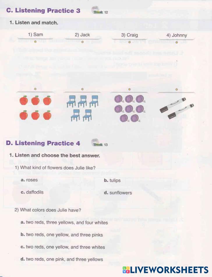 Created byTrung tâm ngoại ngữ Quốc Tế Hoàn Cầu English Listening Listening Skills Age 7-15 level: A1 English Author's Instructions My Google Classroom Courses × 0 classes selected (0 students total) Quick Access Select all classes (0 classes) All Classes Loading courses... Cancel Share Share to selected Course __COURSE_NAME__ __STUDENT_NAME__ (__STUDENT_EMAIL__) Unit 3_practice 3 and 4 Download Worksheet Validation Check my answers Emails my answers to my teacher Full name Group/level School subject Teacher's email or key code Close Submit Validating worksheet... (12) Your answers have been sent to your teacher. Good luck! OK We encountered an error submitting your answers. Please try again. OK Advertisement | Go Ad Free Created byTrung tâm ngoại ngữ Quốc Tế Hoàn Cầu English Listening Listening Skills Age 7-15 level: A1 English Author's Instructions