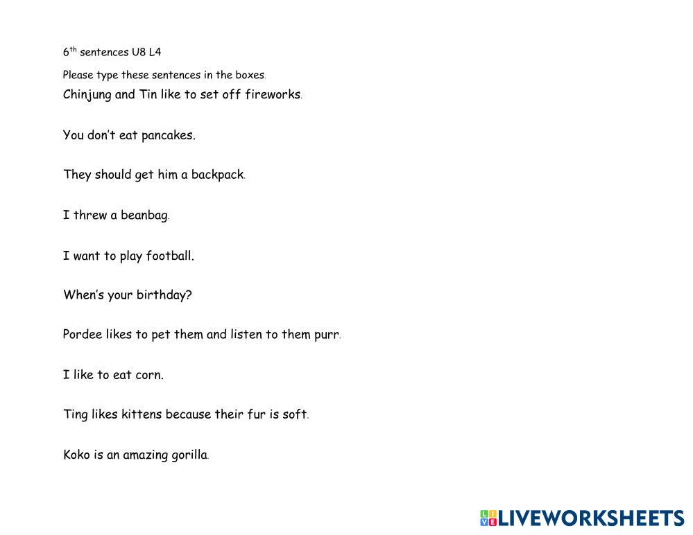 Created byJean Pope English as a Second Language (ESL) Sentences to type Age 11-16 level: 6 English Author's Instructions Sentences from phonics spelling words to type My Google Classroom Courses × 0 classes selected (0 students total) Quick Access Select all classes (0 classes) All Classes Loading courses... Cancel Share Share to selected Course __COURSE_NAME__ __STUDENT_NAME__ (__STUDENT_EMAIL__) 6th spelling U8 L4 Download Worksheet Validation Check my answers Emails my answers to my teacher Full name Group/level School subject Teacher's email or key code Close Submit Validating worksheet... (12) Your answers have been sent to your teacher. Good luck! OK We encountered an error submitting your answers. Please try again. OK Advertisement | Go Ad Free Created byJean Pope English as a Second Language (ESL) Sentences to type Age 11-16 level: 6 English Author's Instructions Sentences from phonics spelling words to type