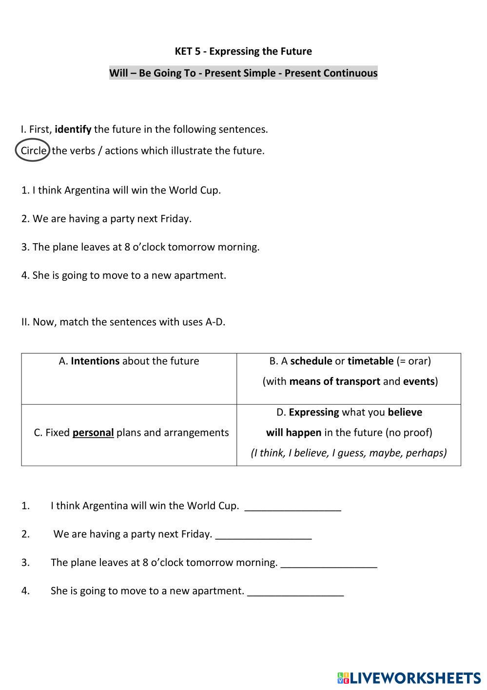 Created by AnaMariaV English as a Second Language (ESL) Future tenses Age 9-12 level: Grade 5 English Author's Instructions Future Tenses My Google Classroom Courses × 0 classes selected (0 students total) Quick Access Select all classes (0 classes) All Classes Loading courses... Cancel Share Share to selected Course __COURSE_NAME__ __STUDENT_NAME__ (__STUDENT_EMAIL__) KET 5 - Expressing the Future Download Worksheet Validation Check my answers Emails my answers to my teacher Full name Group/level School subject Teacher's email or key code Close Submit Validating worksheet... (12) Your answers have been sent to your teacher. Good luck! OK We encountered an error submitting your answers. Please try again. OK Advertisement | Go Ad Free Created by AnaMariaV English as a Second Language (ESL) Future tenses Age 9-12 level: Grade 5 English Author's Instructions Future Tenses