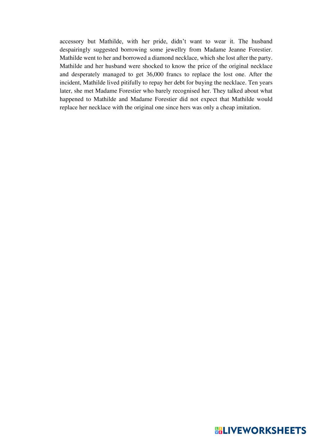 Created byNenik Prihartini English as a Second Language (ESL) Reading and listening Age 10-9 level: Intermediate English Author's Instructions Short Story My Google Classroom Courses × 0 classes selected (0 students total) Quick Access Select all classes (0 classes) All Classes Loading courses... Cancel Share Share to selected Course __COURSE_NAME__ __STUDENT_NAME__ (__STUDENT_EMAIL__) Narrative Text_1 Download Worksheet Validation Check my answers Emails my answers to my teacher Full name Group/level School subject Teacher's email or key code Close Submit Validating worksheet... (12) Your answers have been sent to your teacher. Good luck! OK We encountered an error submitting your answers. Please try again. OK Advertisement | Go Ad Free Created byNenik Prihartini English as a Second Language (ESL) Reading and listening Age 10-9 level: Intermediate English Author's Instructions Short Story