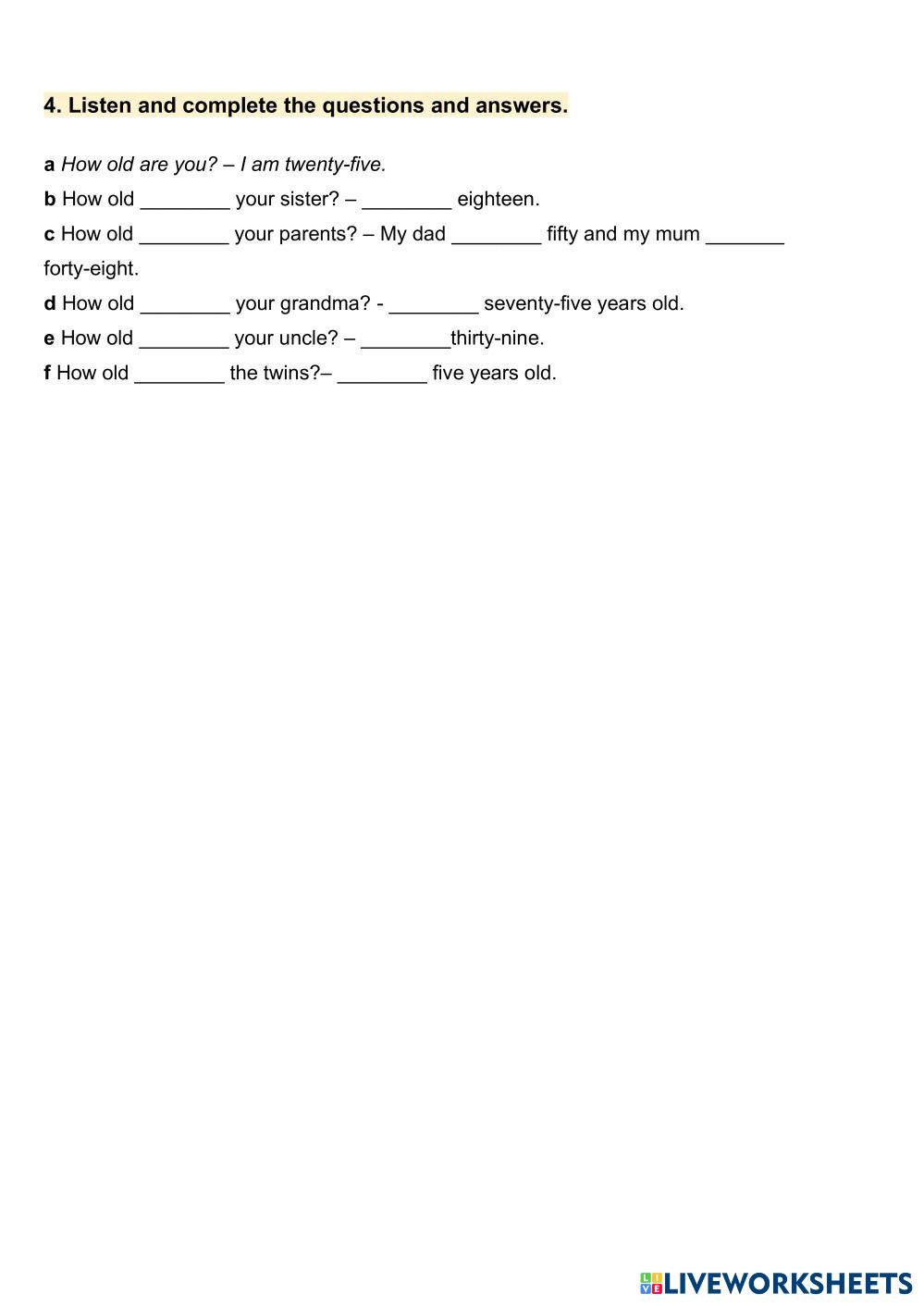 Created by Kate_chetom English as a Second Language (ESL) Numbers Age 12-16 level: A1 English Author's Instructions My Google Classroom Courses × 0 classes selected (0 students total) Quick Access Select all classes (0 classes) All Classes Loading courses... Cancel Share Share to selected Course __COURSE_NAME__ __STUDENT_NAME__ (__STUDENT_EMAIL__) Numbers Download Worksheet Validation Check my answers Emails my answers to my teacher Full name Group/level School subject Teacher's email or key code Close Submit Validating worksheet... (12) Your answers have been sent to your teacher. Good luck! OK We encountered an error submitting your answers. Please try again. OK Advertisement | Go Ad Free Created by Kate_chetom English as a Second Language (ESL) Numbers Age 12-16 level: A1 English Author's Instructions