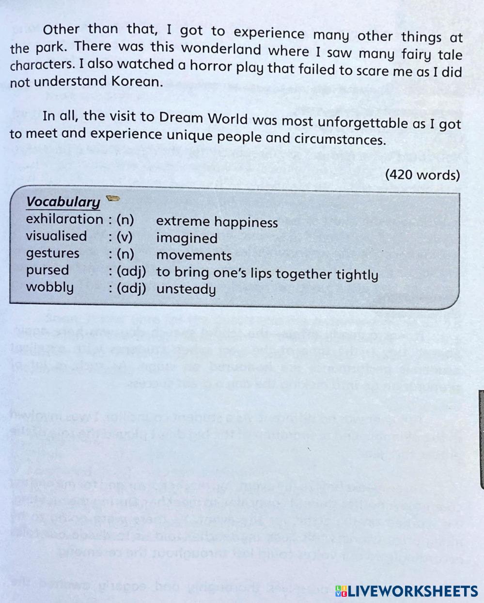 Created by ponyson English as a Second Language (ESL) Essay writing Age 14-12 level: lower secondary English Author's Instructions My Google Classroom Courses × 0 classes selected (0 students total) Quick Access Select all classes (0 classes) All Classes Loading courses... Cancel Share Share to selected Course __COURSE_NAME__ __STUDENT_NAME__ (__STUDENT_EMAIL__) Model essay-Unforgettable Visit Download Worksheet Validation Check my answers Emails my answers to my teacher Full name Group/level School subject Teacher's email or key code Close Submit Validating worksheet... (12) Your answers have been sent to your teacher. Good luck! OK We encountered an error submitting your answers. Please try again. OK Advertisement | Go Ad Free Created by ponyson English as a Second Language (ESL) Essay writing Age 14-12 level: lower secondary English Author's Instructions