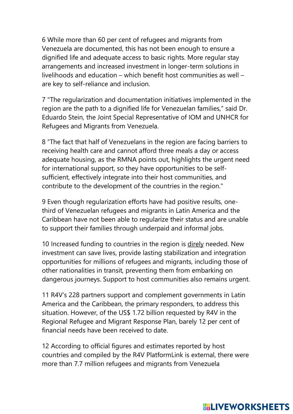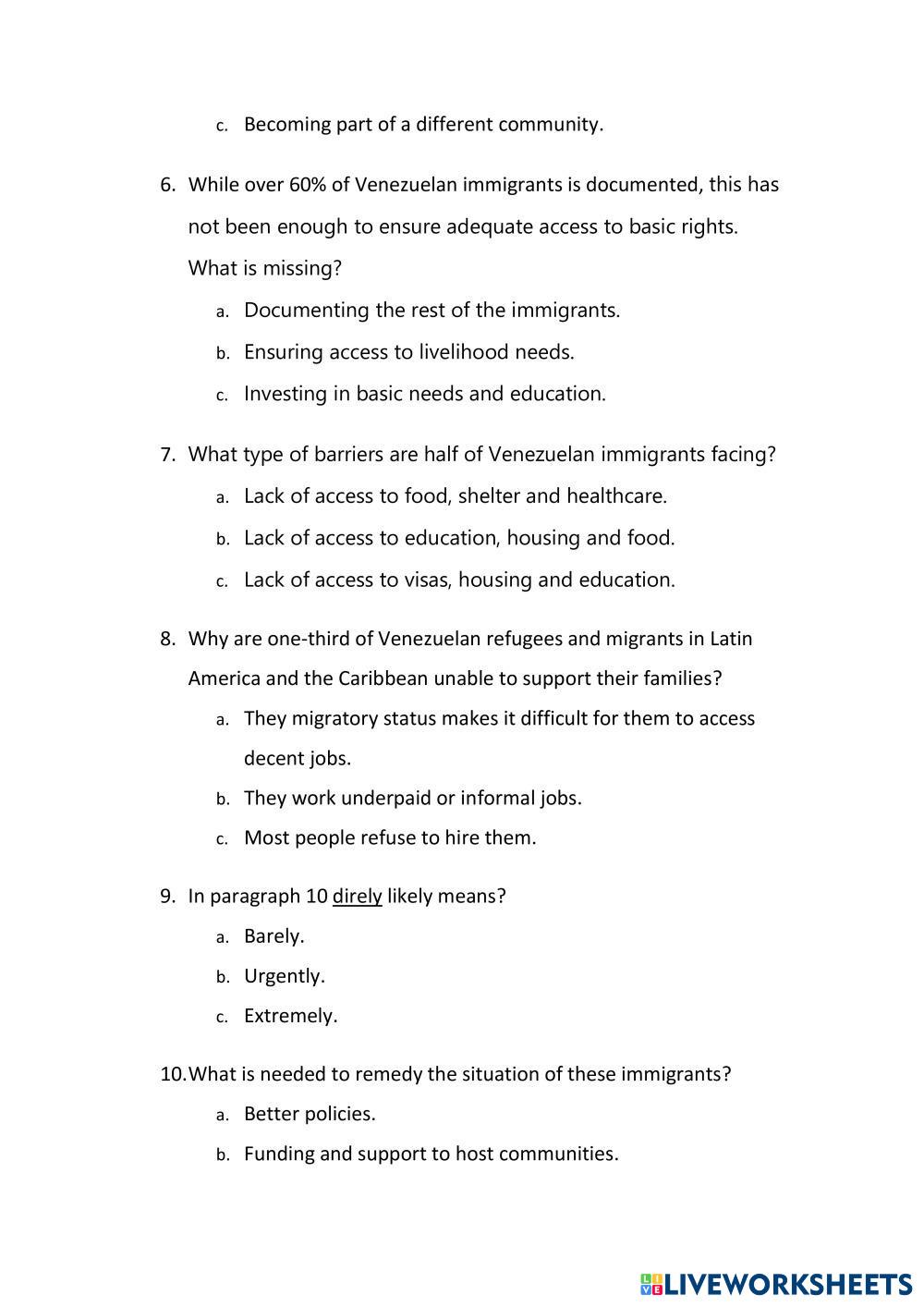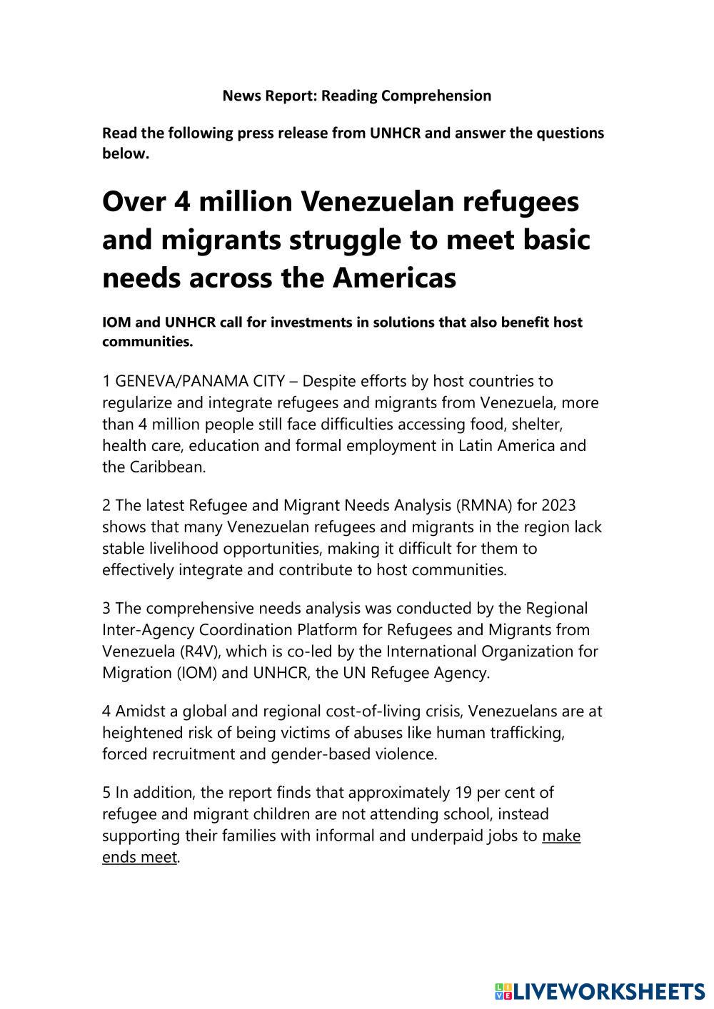 Created byIsabel María Jervis Hidalgo English as a Second Language (ESL) News Age 14-16 level: ESL 3 English Author's Instructions My Google Classroom Courses × 0 classes selected (0 students total) Quick Access Select all classes (0 classes) All Classes Loading courses... Cancel Share Share to selected Course __COURSE_NAME__ __STUDENT_NAME__ (__STUDENT_EMAIL__) News Report Reading Assignment Download Worksheet Validation Check my answers Emails my answers to my teacher Full name Group/level School subject Teacher's email or key code Close Submit Validating worksheet... (12) Your answers have been sent to your teacher. Good luck! OK We encountered an error submitting your answers. Please try again. OK Advertisement | Go Ad Free Created byIsabel María Jervis Hidalgo English as a Second Language (ESL) News Age 14-16 level: ESL 3 English Author's Instructions