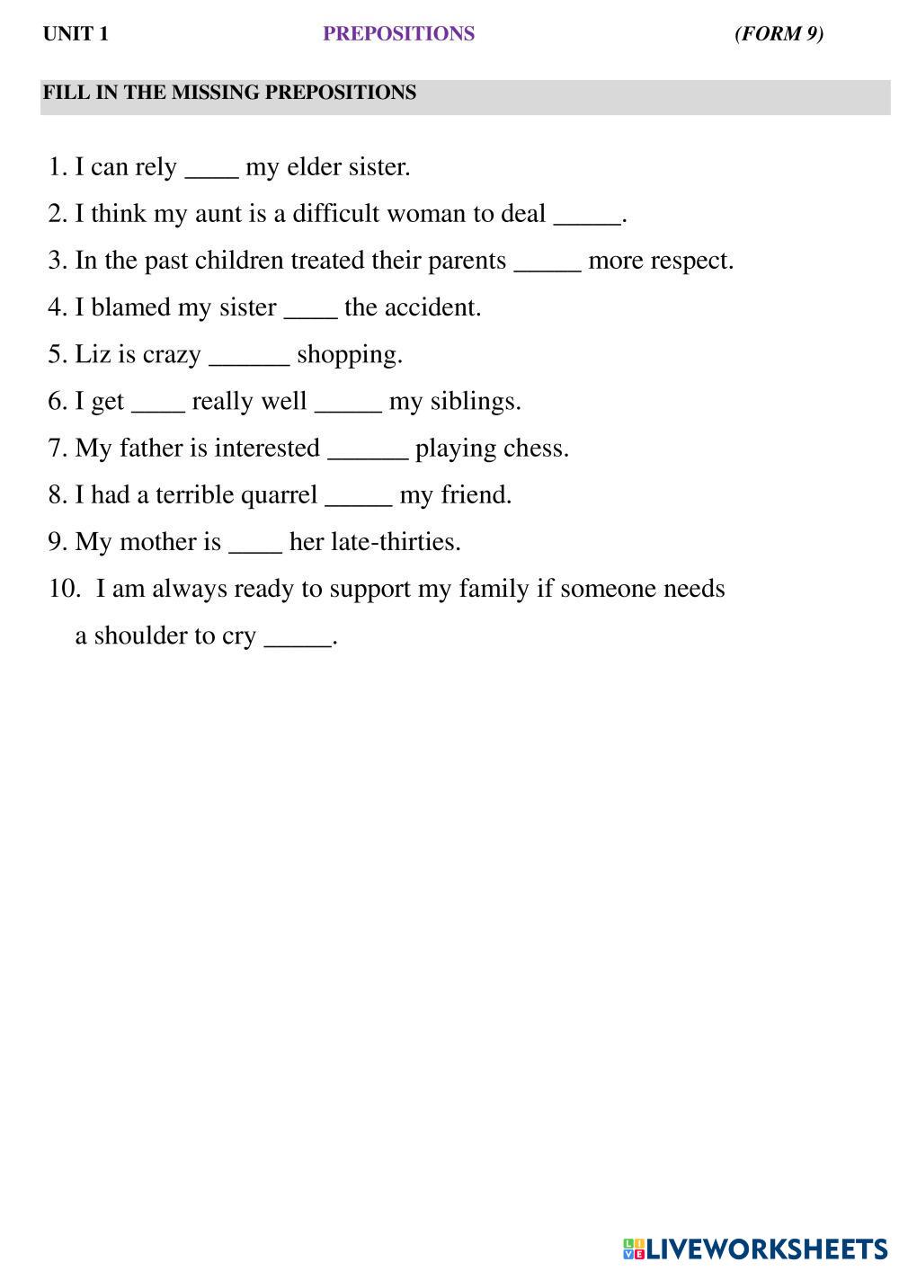 Created by Mika_tima English as a Second Language (ESL) Prepositions Form 9 U1 Family Age 13-16 level: 9 English Author's Instructions My Google Classroom Courses × 0 classes selected (0 students total) Quick Access Select all classes (0 classes) All Classes Loading courses... Cancel Share Share to selected Course __COURSE_NAME__ __STUDENT_NAME__ (__STUDENT_EMAIL__) Prepositions Form 9 U1 Family Download Worksheet Validation Check my answers Emails my answers to my teacher Full name Group/level School subject Teacher's email or key code Close Submit Validating worksheet... (12) Your answers have been sent to your teacher. Good luck! OK We encountered an error submitting your answers. Please try again. OK Advertisement | Go Ad Free Created by Mika_tima English as a Second Language (ESL) Prepositions Form 9 U1 Family Age 13-16 level: 9 English Author's Instructions