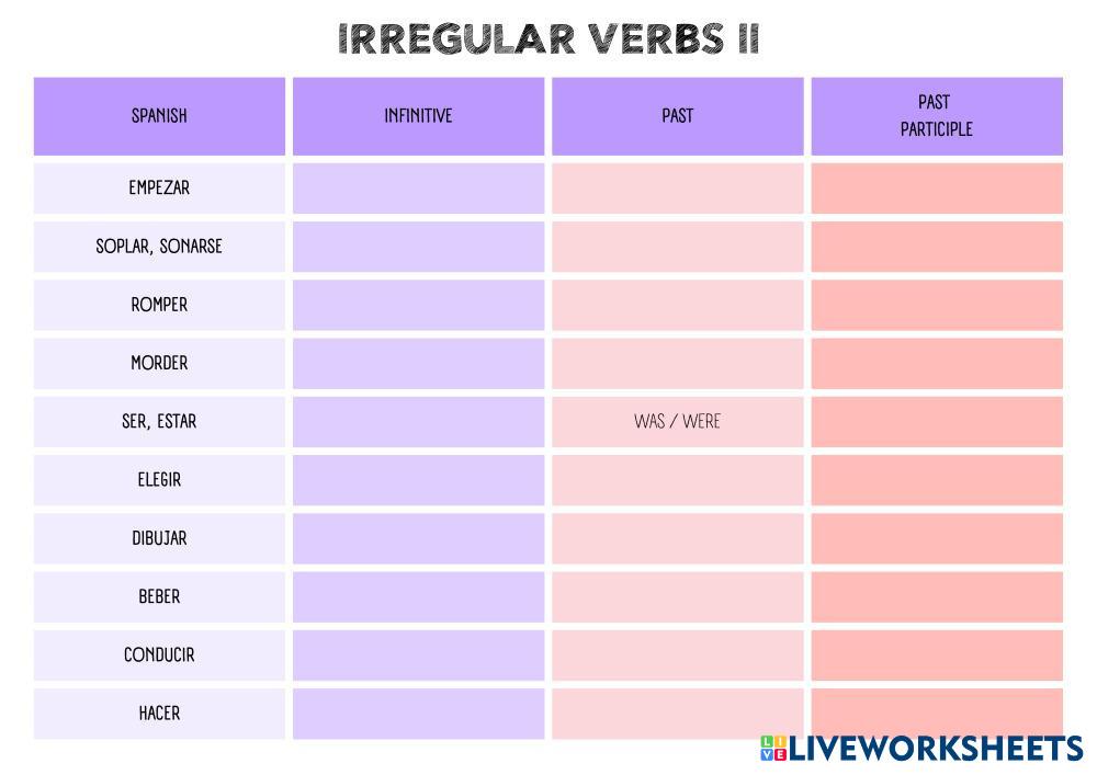 Created byYasmina English as a Second Language (ESL) Irregular verbs Age 9 level: 5º English Author's Instructions My Google Classroom Courses × 0 classes selected (0 students total) Quick Access Select all classes (0 classes) All Classes Loading courses... Cancel Share Share to selected Course __COURSE_NAME__ __STUDENT_NAME__ (__STUDENT_EMAIL__) Irregular Verbs x10 Download Worksheet Validation Check my answers Emails my answers to my teacher Full name Group/level School subject Teacher's email or key code Close Submit Validating worksheet... (12) Your answers have been sent to your teacher. Good luck! OK We encountered an error submitting your answers. Please try again. OK Advertisement | Go Ad Free Created byYasmina English as a Second Language (ESL) Irregular verbs Age 9 level: 5º English Author's Instructions