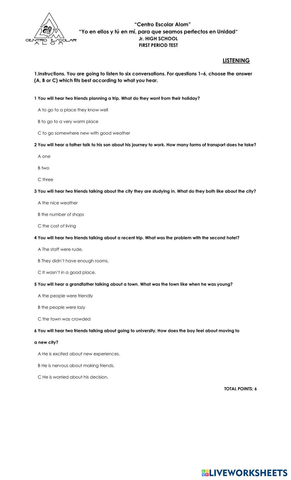 Created by xoch English as a Second Language (ESL) Listening comprehension Age 9-16 level: JR HIGH English Author's Instructions My Google Classroom Courses × 0 classes selected (0 students total) Quick Access Select all classes (0 classes) All Classes Loading courses... Cancel Share Share to selected Course __COURSE_NAME__ __STUDENT_NAME__ (__STUDENT_EMAIL__) Listening exam Download Worksheet Validation Check my answers Emails my answers to my teacher Full name Group/level School subject Teacher's email or key code Close Submit Validating worksheet... (12) Your answers have been sent to your teacher. Good luck! OK We encountered an error submitting your answers. Please try again. OK Advertisement | Go Ad Free Created by xoch English as a Second Language (ESL) Listening comprehension Age 9-16 level: JR HIGH English Author's Instructions