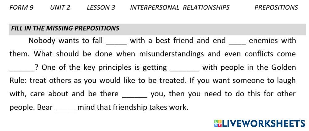 Created by Mika_tima English as a Second Language (ESL) friendship prepositions Age 10-16 level: 9 English Author's Instructions My Google Classroom Courses × 0 classes selected (0 students total) Quick Access Select all classes (0 classes) All Classes Loading courses... Cancel Share Share to selected Course __COURSE_NAME__ __STUDENT_NAME__ (__STUDENT_EMAIL__) Friendship prepositions Download Worksheet Validation Check my answers Emails my answers to my teacher Full name Group/level School subject Teacher's email or key code Close Submit Validating worksheet... (12) Your answers have been sent to your teacher. Good luck! OK We encountered an error submitting your answers. Please try again. OK Advertisement | Go Ad Free Created by Mika_tima English as a Second Language (ESL) friendship prepositions Age 10-16 level: 9 English Author's Instructions