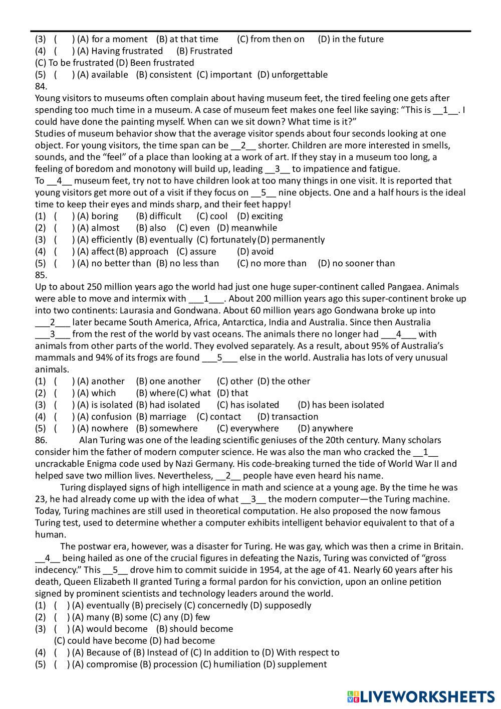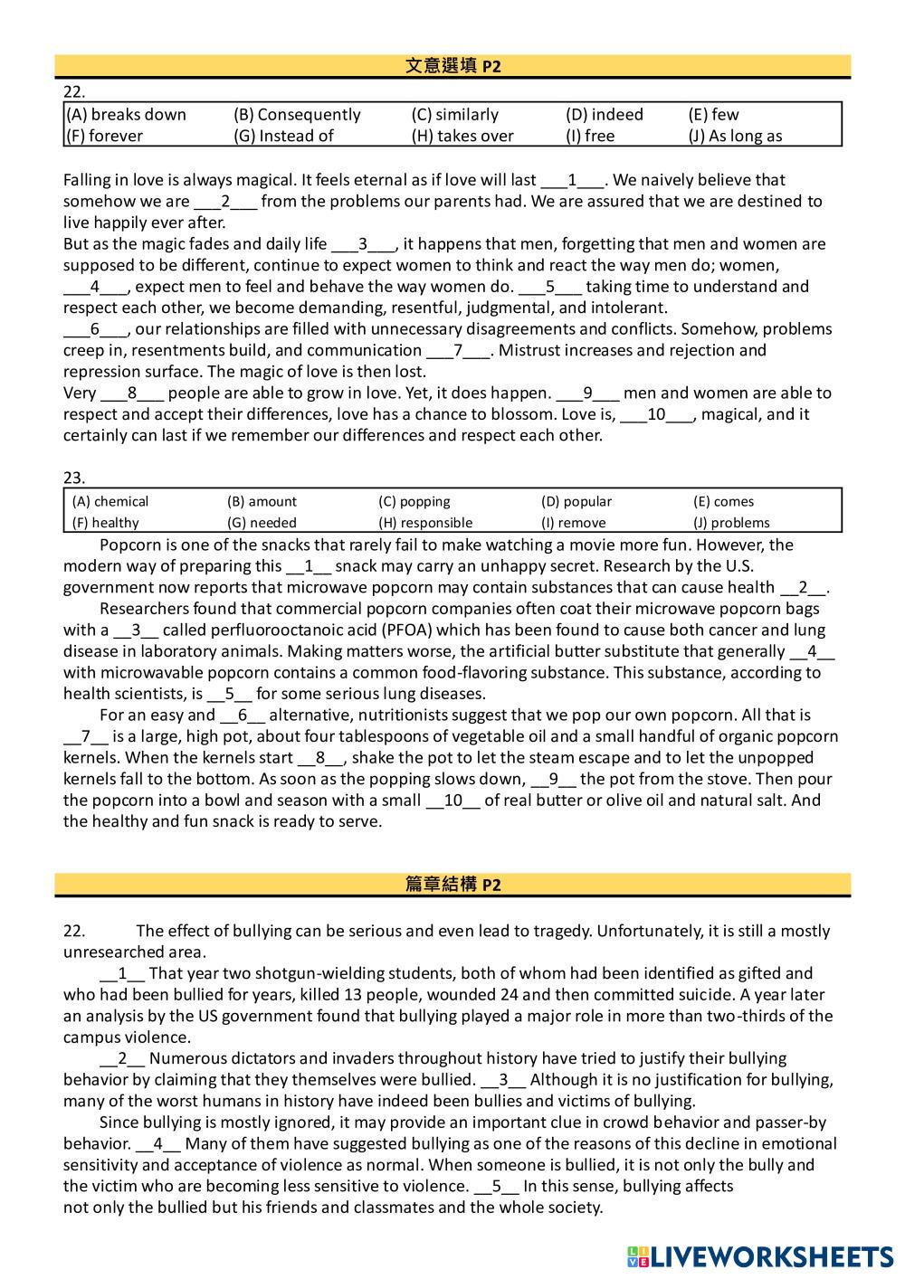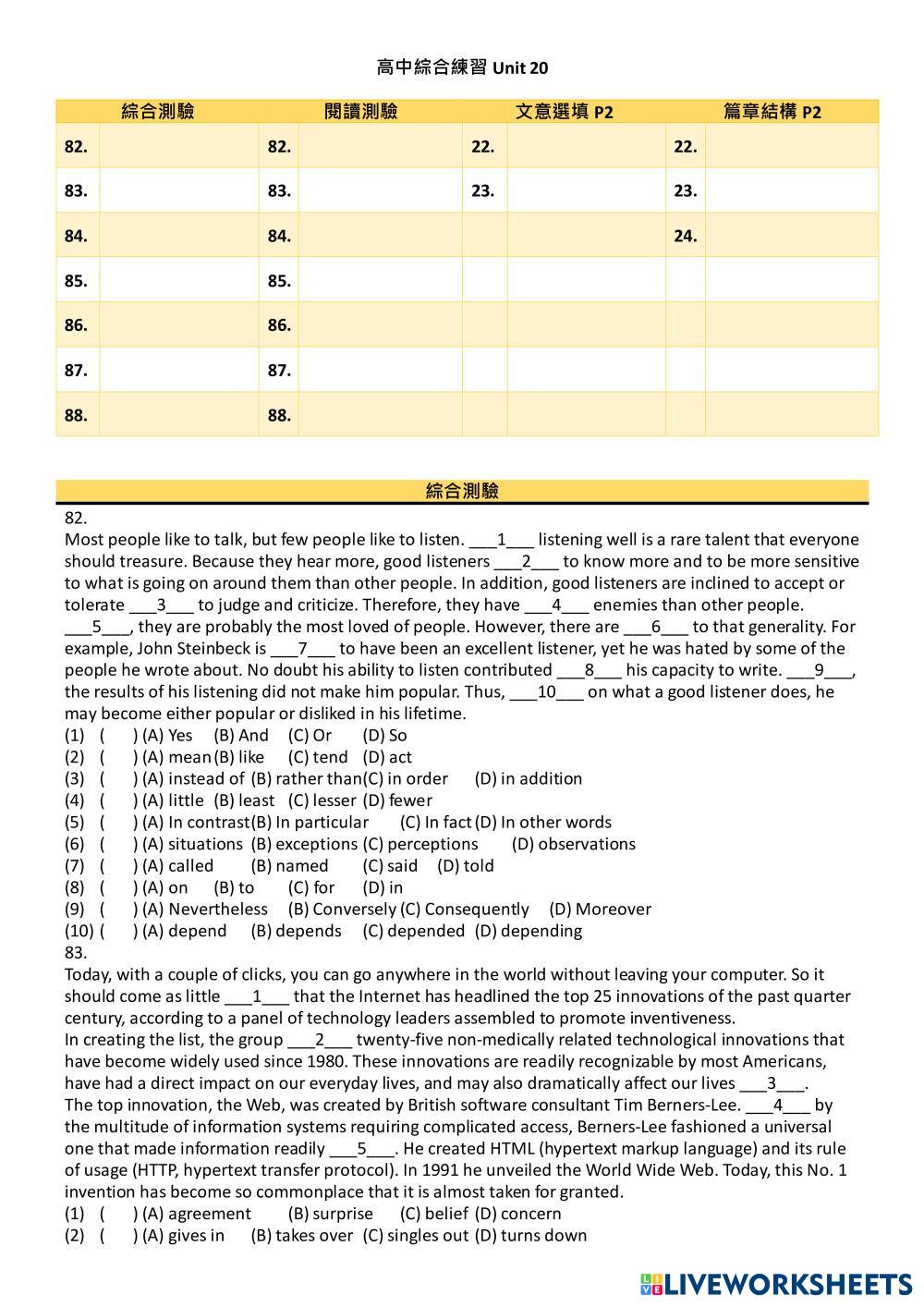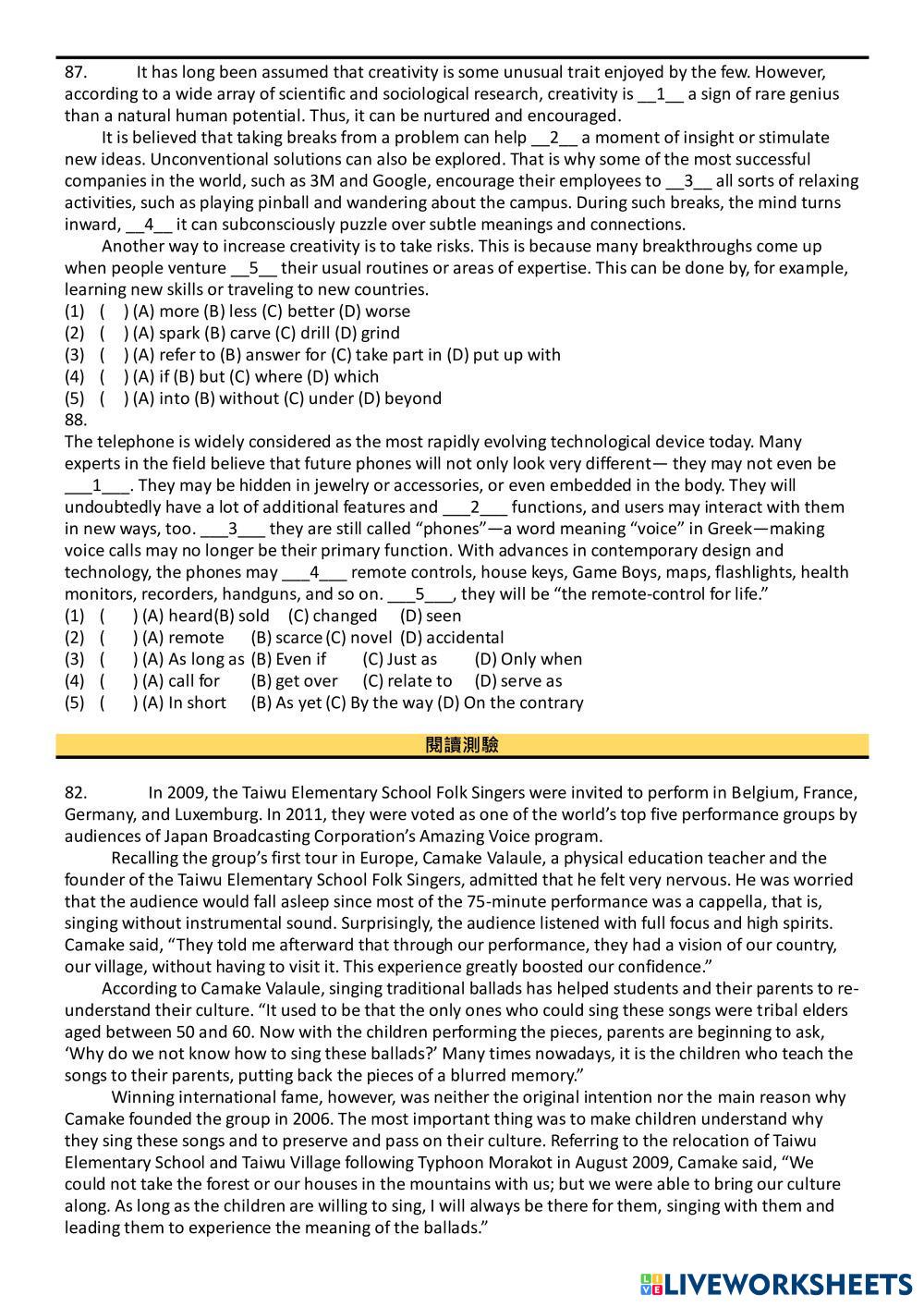 Created by gabe201718 English as a Second Language (ESL) Grammar and Reading Age 15+ level: Grade 12 English Author's Instructions My Google Classroom Courses × 0 classes selected (0 students total) Quick Access Select all classes (0 classes) All Classes Loading courses... Cancel Share Share to selected Course __COURSE_NAME__ __STUDENT_NAME__ (__STUDENT_EMAIL__) 高中綜合練習Unit 20 Download Worksheet Validation Check my answers Emails my answers to my teacher Full name Group/level School subject Teacher's email or key code Close Submit Validating worksheet... (12) Your answers have been sent to your teacher. Good luck! OK We encountered an error submitting your answers. Please try again. OK Advertisement | Go Ad Free Created by gabe201718 English as a Second Language (ESL) Grammar and Reading Age 15+ level: Grade 12 English Author's Instructions