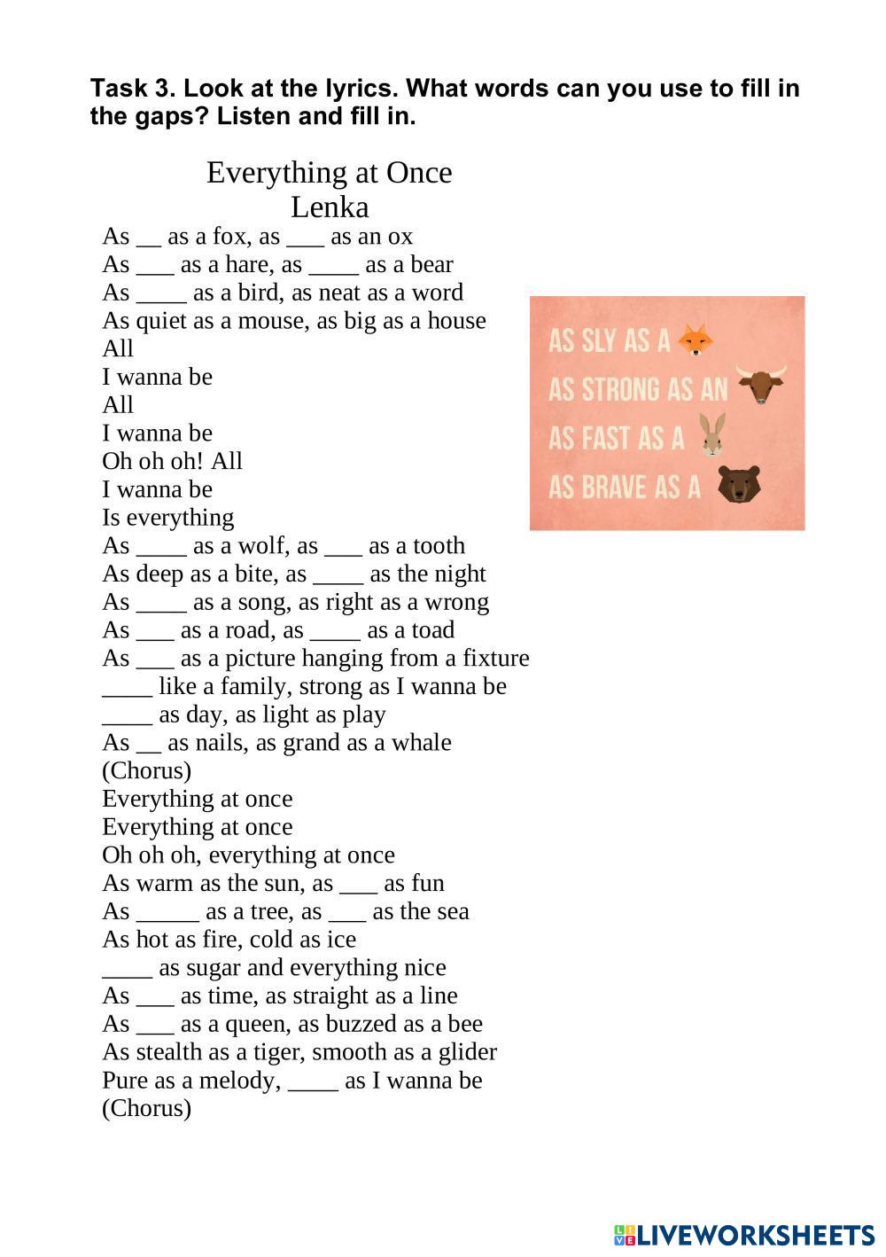 Created bydasha pohorielova English as a Second Language (ESL) b1.1 Age 13+ level: b1.1 English Author's Instructions b1.1 My Google Classroom Courses × 0 classes selected (0 students total) Quick Access Select all classes (0 classes) All Classes Loading courses... Cancel Share Share to selected Course __COURSE_NAME__ __STUDENT_NAME__ (__STUDENT_EMAIL__) b1.1 Download Worksheet Validation Check my answers Emails my answers to my teacher Full name Group/level School subject Teacher's email or key code Close Submit Validating worksheet... (12) Your answers have been sent to your teacher. Good luck! OK We encountered an error submitting your answers. Please try again. OK Advertisement | Go Ad Free Created bydasha pohorielova English as a Second Language (ESL) b1.1 Age 13+ level: b1.1 English Author's Instructions b1.1
