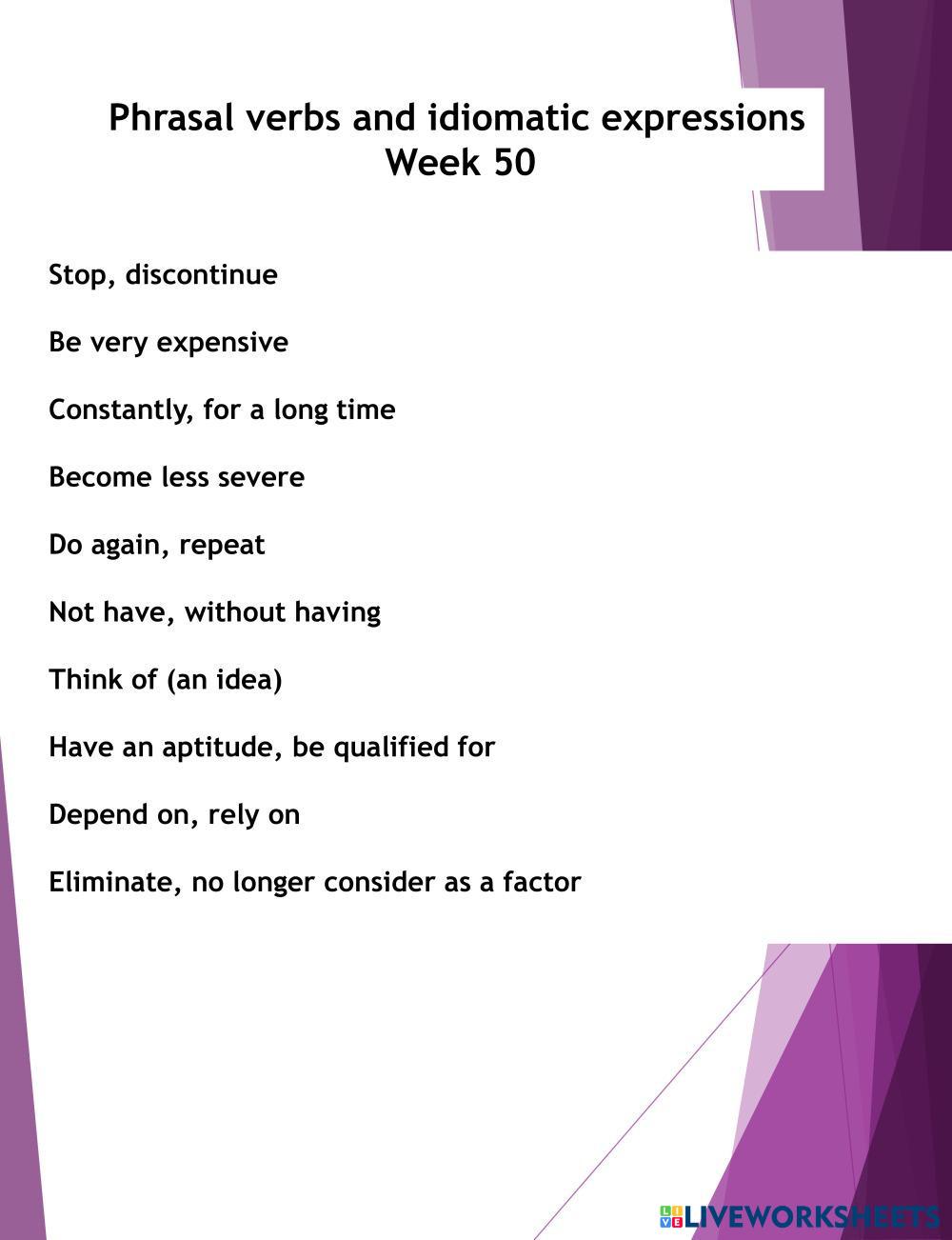 Created byOmar Cana English as a Second Language (ESL) Vocabulary Age 11+ level: advanced English Author's Instructions My Google Classroom Courses × 0 classes selected (0 students total) Quick Access Select all classes (0 classes) All Classes Loading courses... Cancel Share Share to selected Course __COURSE_NAME__ __STUDENT_NAME__ (__STUDENT_EMAIL__) Week 50 Download Worksheet Validation Check my answers Emails my answers to my teacher Full name Group/level School subject Teacher's email or key code Close Submit Validating worksheet... (12) Your answers have been sent to your teacher. Good luck! OK We encountered an error submitting your answers. Please try again. OK Advertisement | Go Ad Free Created byOmar Cana English as a Second Language (ESL) Vocabulary Age 11+ level: advanced English Author's Instructions