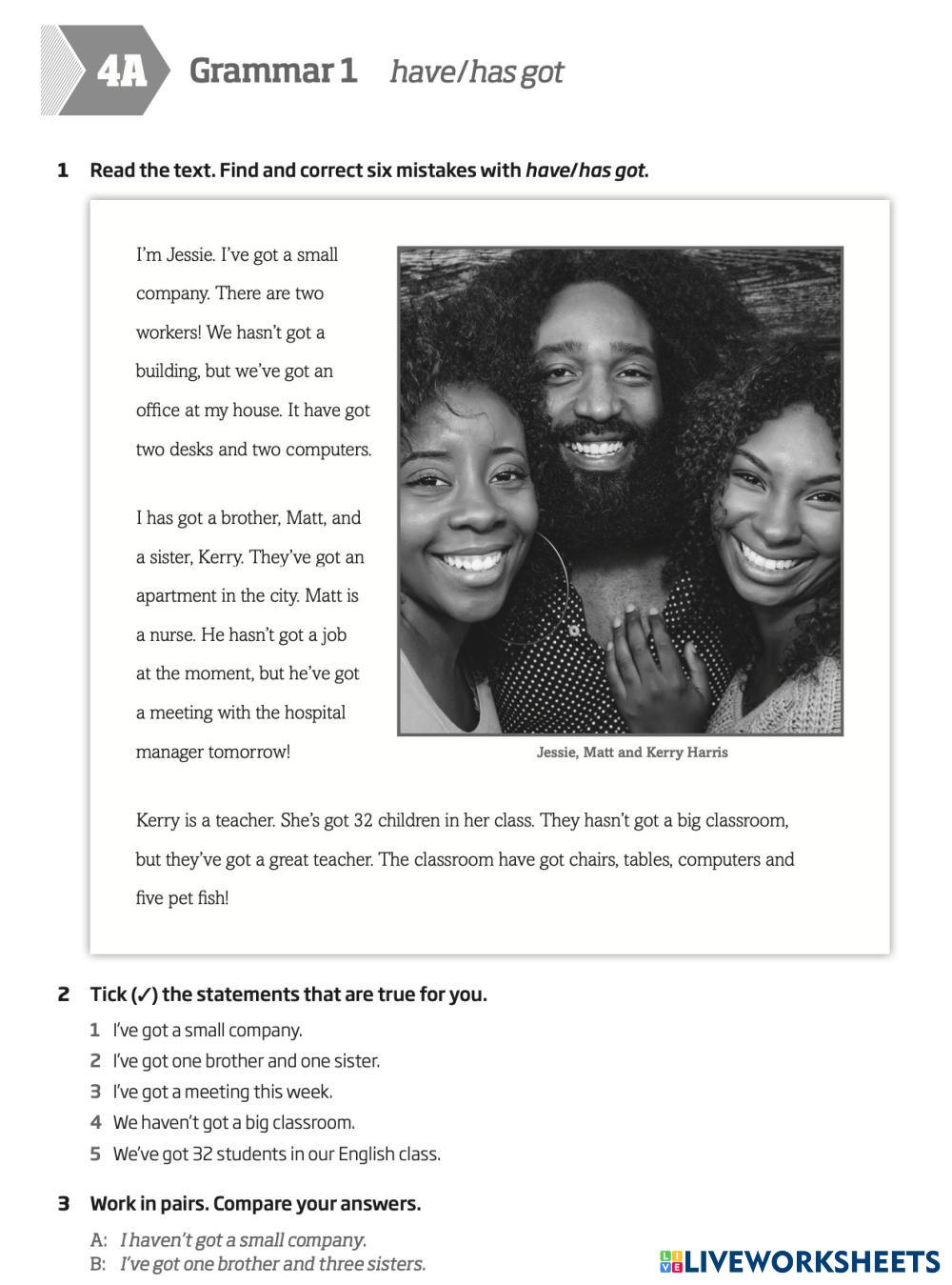 Created byThe Touchstone Academy English as a Second Language (ESL) have/has got Age 18+ level: A1 English Author's Instructions My Google Classroom Courses × 0 classes selected (0 students total) Quick Access Select all classes (0 classes) All Classes Loading courses... Cancel Share Share to selected Course __COURSE_NAME__ __STUDENT_NAME__ (__STUDENT_EMAIL__) Roadmap A1 4A Download Worksheet Validation Check my answers Emails my answers to my teacher Full name Group/level School subject Teacher's email or key code Close Submit Validating worksheet... (12) Your answers have been sent to your teacher. Good luck! OK We encountered an error submitting your answers. Please try again. OK Advertisement | Go Ad Free Created byThe Touchstone Academy English as a Second Language (ESL) have/has got Age 18+ level: A1 English Author's Instructions