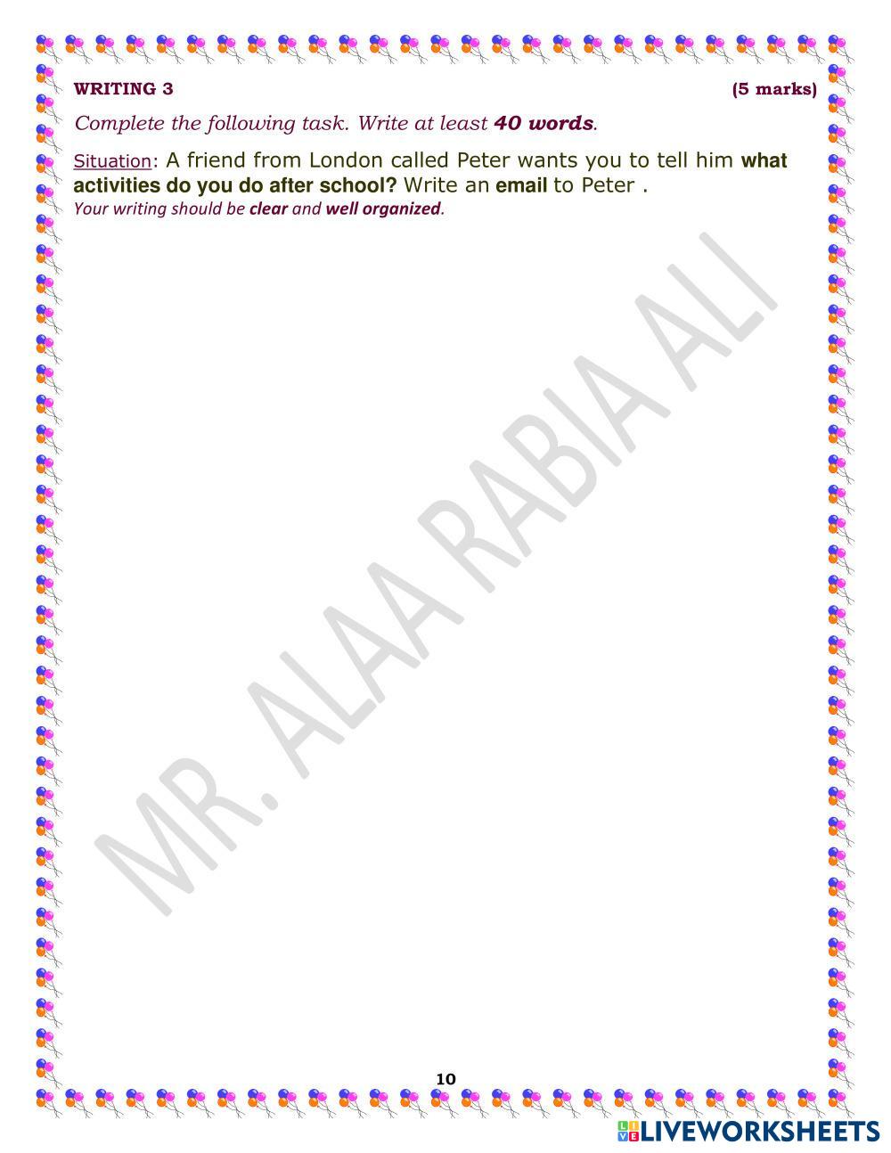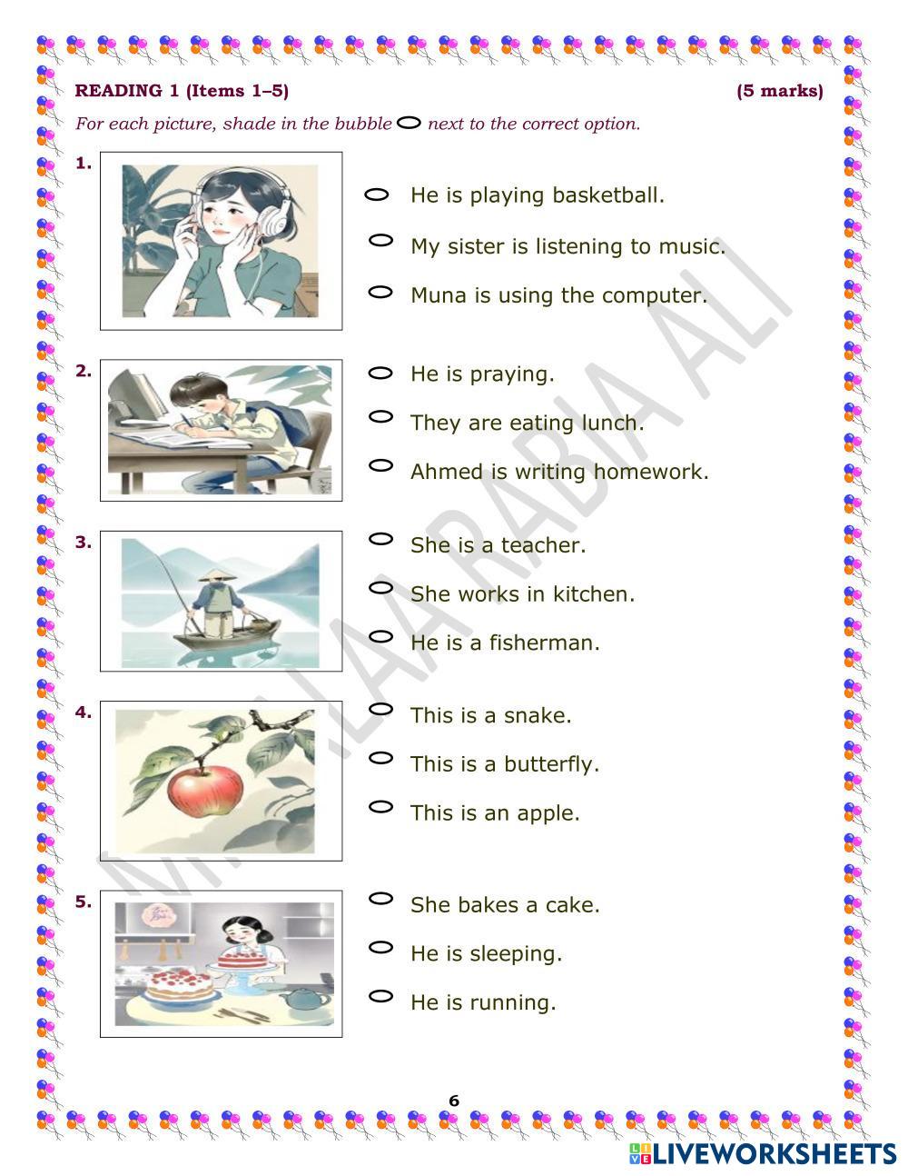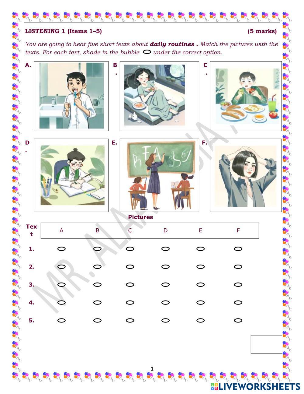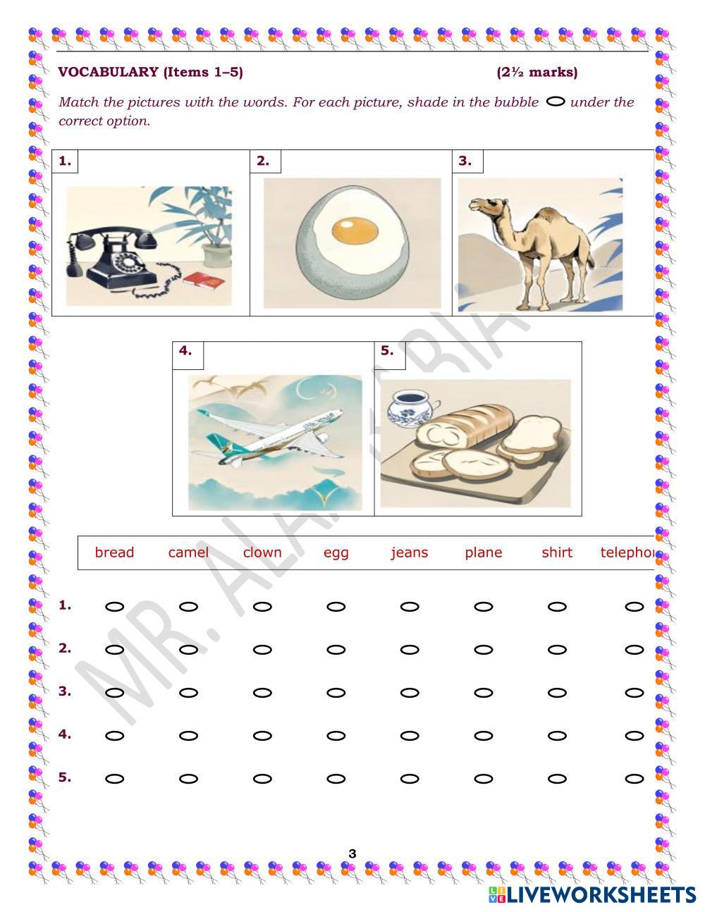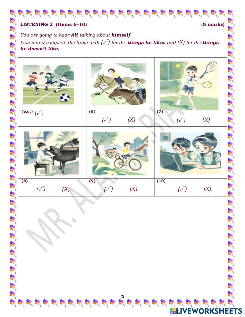 Created byAlaa Rabia Ali English as a Second Language (ESL) Listening and vocabulary Age 10+ level: 7 - 9 English Author's Instructions Students answer all the tasks My Google Classroom Courses × 0 classes selected (0 students total) Quick Access Select all classes (0 classes) All Classes Loading courses... Cancel Share Share to selected Course __COURSE_NAME__ __STUDENT_NAME__ (__STUDENT_EMAIL__) GRADE 5 MOCK EXAM NO. 5 S 1 Download Worksheet Validation Check my answers Emails my answers to my teacher Full name Group/level School subject Teacher's email or key code Close Submit Validating worksheet... (12) Your answers have been sent to your teacher. Good luck! OK We encountered an error submitting your answers. Please try again. OK Advertisement | Go Ad Free Created byAlaa Rabia Ali English as a Second Language (ESL) Listening and vocabulary Age 10+ level: 7 - 9 English Author's Instructions Students answer all the tasks