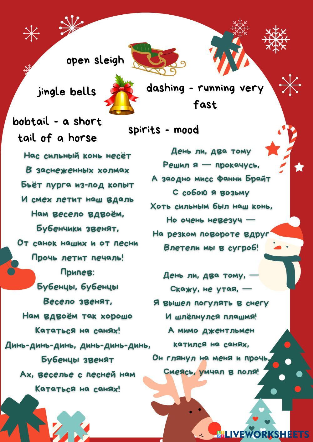 Created byInna_ard English as a Second Language (ESL) Vocabulary Age 16+ level: A2-B1 English Author's Instructions The story behind the song "Jingle Bells" My Google Classroom Courses × 0 classes selected (0 students total) Quick Access Select all classes (0 classes) All Classes Loading courses... Cancel Share Share to selected Course __COURSE_NAME__ __STUDENT_NAME__ (__STUDENT_EMAIL__) Jingle Bells Download Worksheet Validation Check my answers Emails my answers to my teacher Full name Group/level School subject Teacher's email or key code Close Submit Validating worksheet... (12) Your answers have been sent to your teacher. Good luck! OK We encountered an error submitting your answers. Please try again. OK Advertisement | Go Ad Free Created byInna_ard English as a Second Language (ESL) Vocabulary Age 16+ level: A2-B1 English Author's Instructions The story behind the song "Jingle Bells"