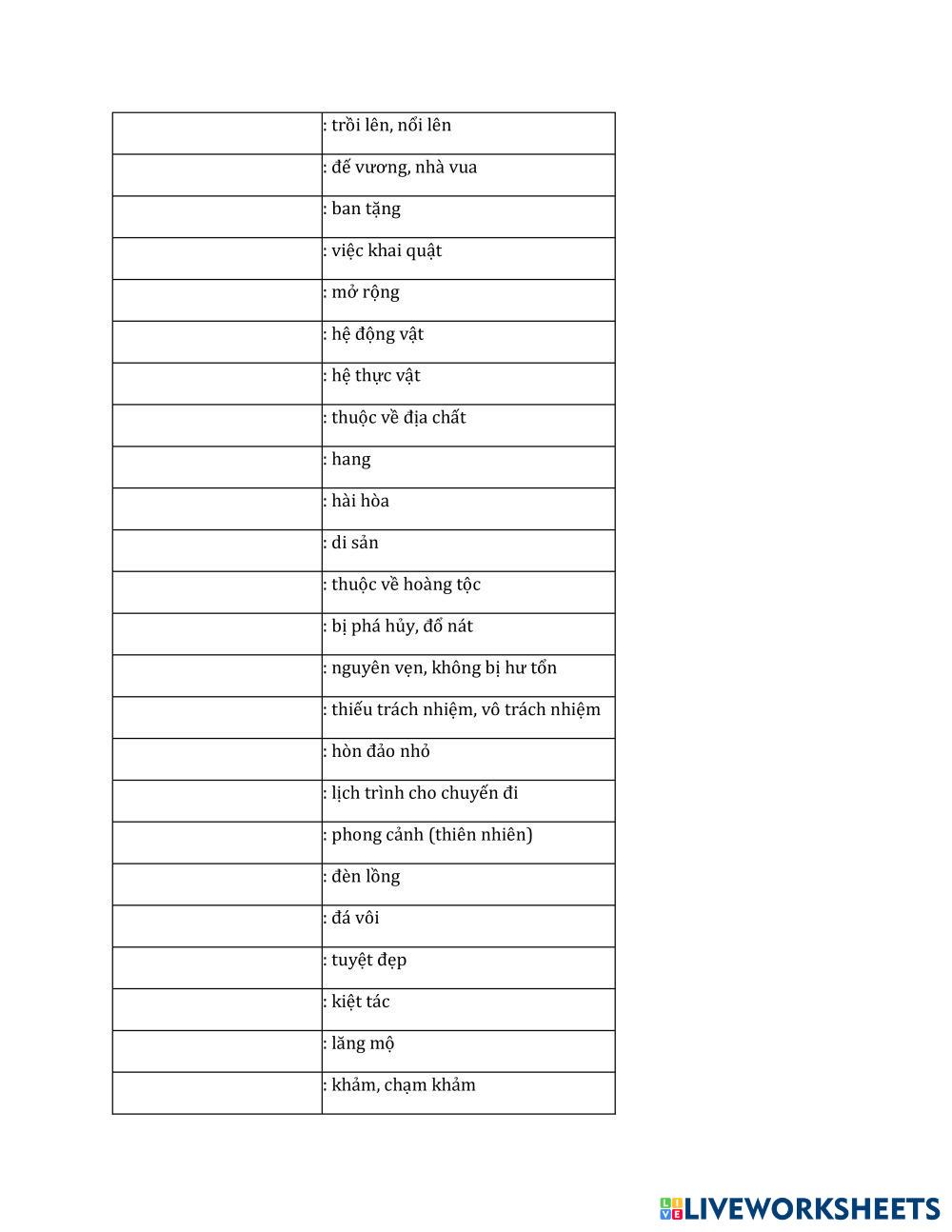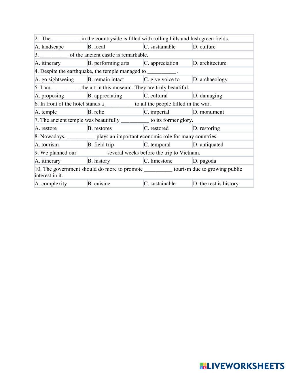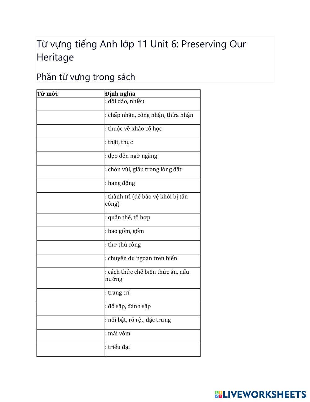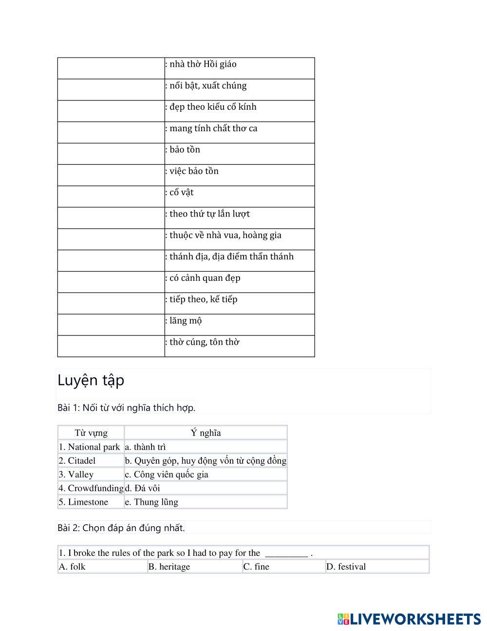 Created byTran Trang English as a Second Language (ESL) Vocabulary Age 16+ level: Intermediate English Author's Instructions My Google Classroom Courses × 0 classes selected (0 students total) Quick Access Select all classes (0 classes) All Classes Loading courses... Cancel Share Share to selected Course __COURSE_NAME__ __STUDENT_NAME__ (__STUDENT_EMAIL__) Global Success 11 - Unit 6 Download Worksheet Validation Check my answers Emails my answers to my teacher Full name Group/level School subject Teacher's email or key code Close Submit Validating worksheet... (12) Your answers have been sent to your teacher. Good luck! OK We encountered an error submitting your answers. Please try again. OK Advertisement | Go Ad Free Created byTran Trang English as a Second Language (ESL) Vocabulary Age 16+ level: Intermediate English Author's Instructions