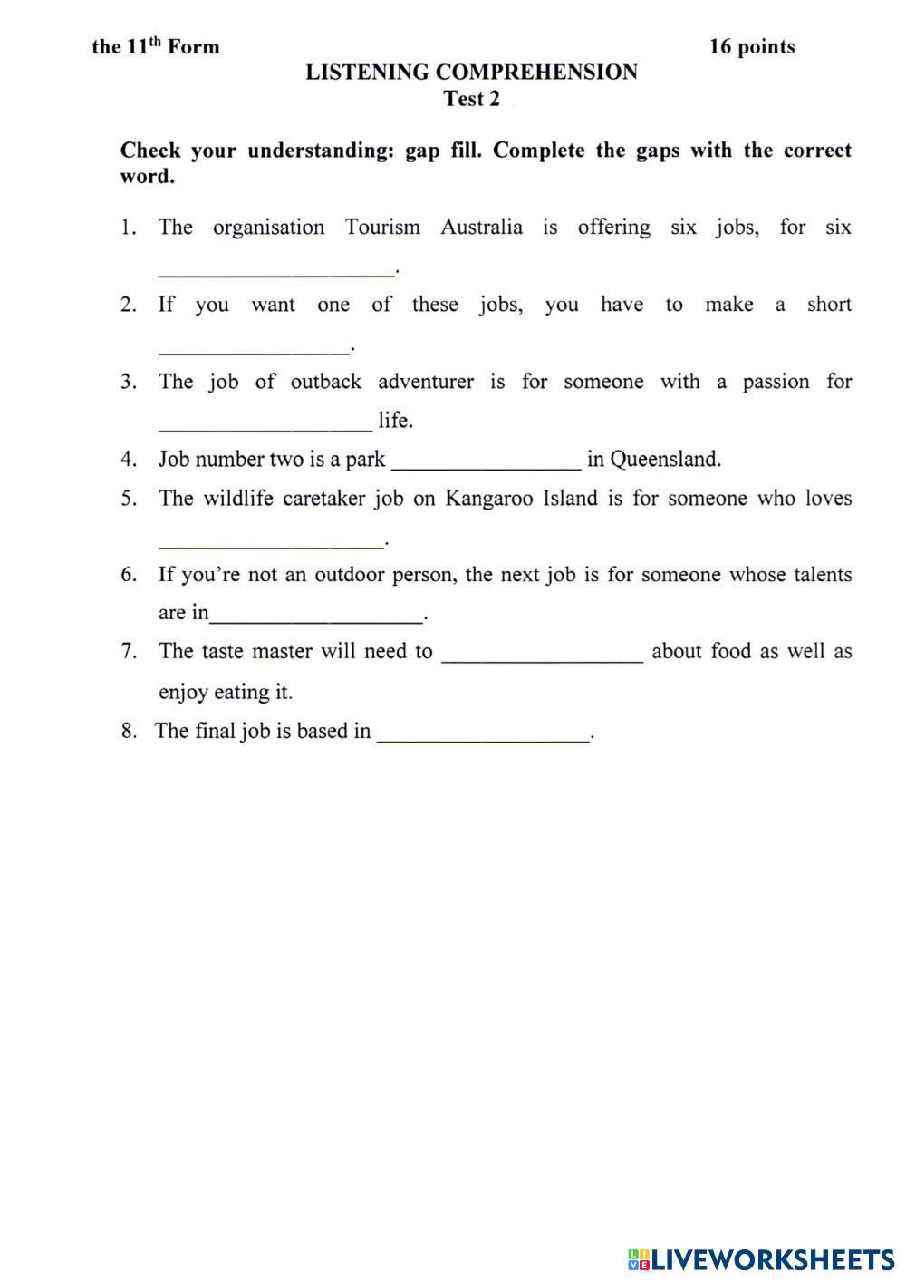 Created by Mika_tima English as a Second Language (ESL) Listening comprehension Age 10+ level: 10 English Author's Instructions My Google Classroom Courses × 0 classes selected (0 students total) Quick Access Select all classes (0 classes) All Classes Loading courses... Cancel Share Share to selected Course __COURSE_NAME__ __STUDENT_NAME__ (__STUDENT_EMAIL__) Олимпиада Form 11 2 этап 2023 Listening text 2 Download Worksheet Validation Check my answers Emails my answers to my teacher Full name Group/level School subject Teacher's email or key code Close Submit Validating worksheet... (12) Your answers have been sent to your teacher. Good luck! OK We encountered an error submitting your answers. Please try again. OK Advertisement | Go Ad Free Created by Mika_tima English as a Second Language (ESL) Listening comprehension Age 10+ level: 10 English Author's Instructions