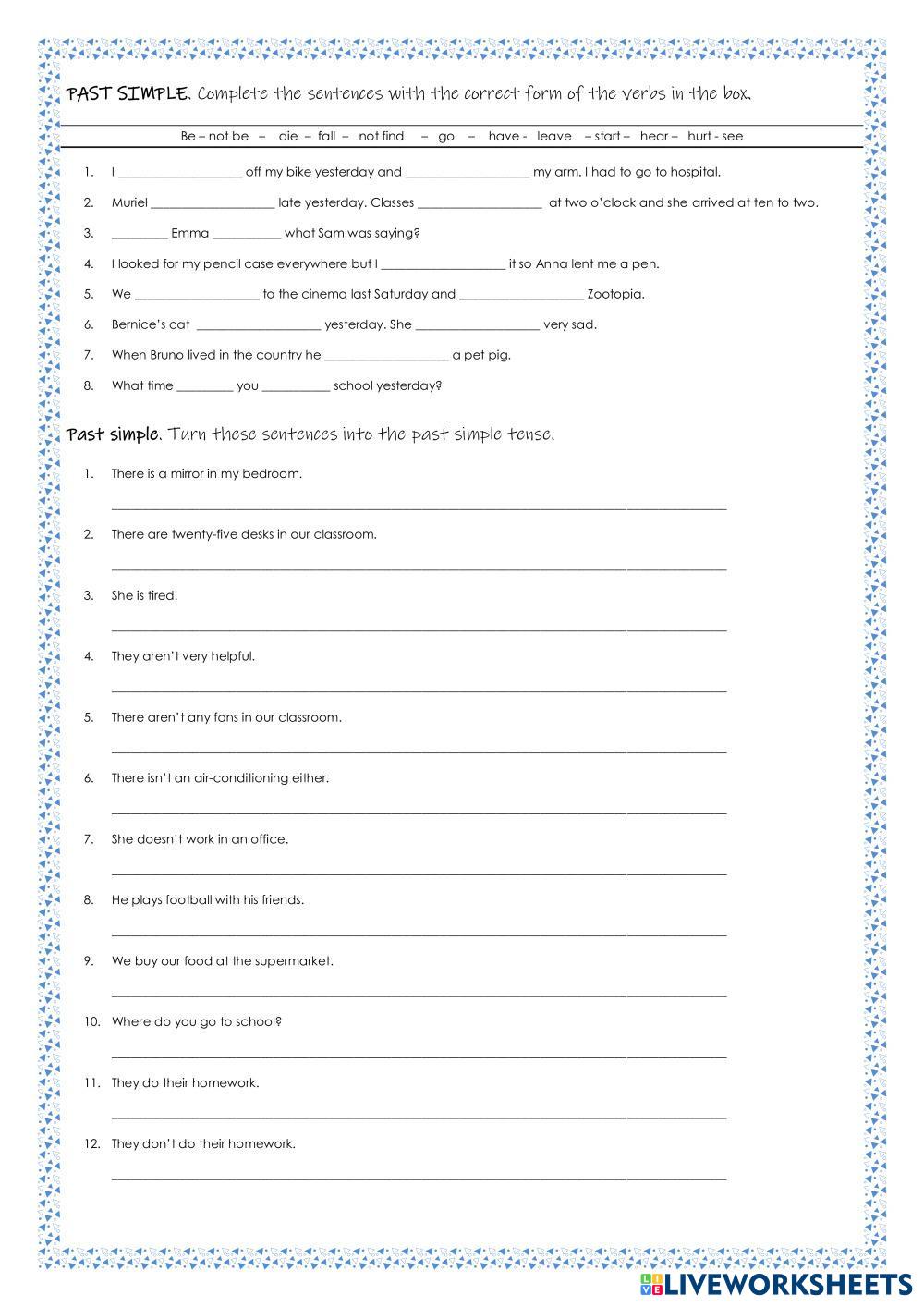 Created by JuditR English as a Second Language (ESL) Past simple Age 12+ level: A2+ English Author's Instructions My Google Classroom Courses × 0 classes selected (0 students total) Quick Access Select all classes (0 classes) All Classes Loading courses... Cancel Share Share to selected Course __COURSE_NAME__ __STUDENT_NAME__ (__STUDENT_EMAIL__) Past simple Download Worksheet Validation Check my answers Emails my answers to my teacher Full name Group/level School subject Teacher's email or key code Close Submit Validating worksheet... (12) Your answers have been sent to your teacher. Good luck! OK We encountered an error submitting your answers. Please try again. OK Advertisement | Go Ad Free Created by JuditR English as a Second Language (ESL) Past simple Age 12+ level: A2+ English Author's Instructions