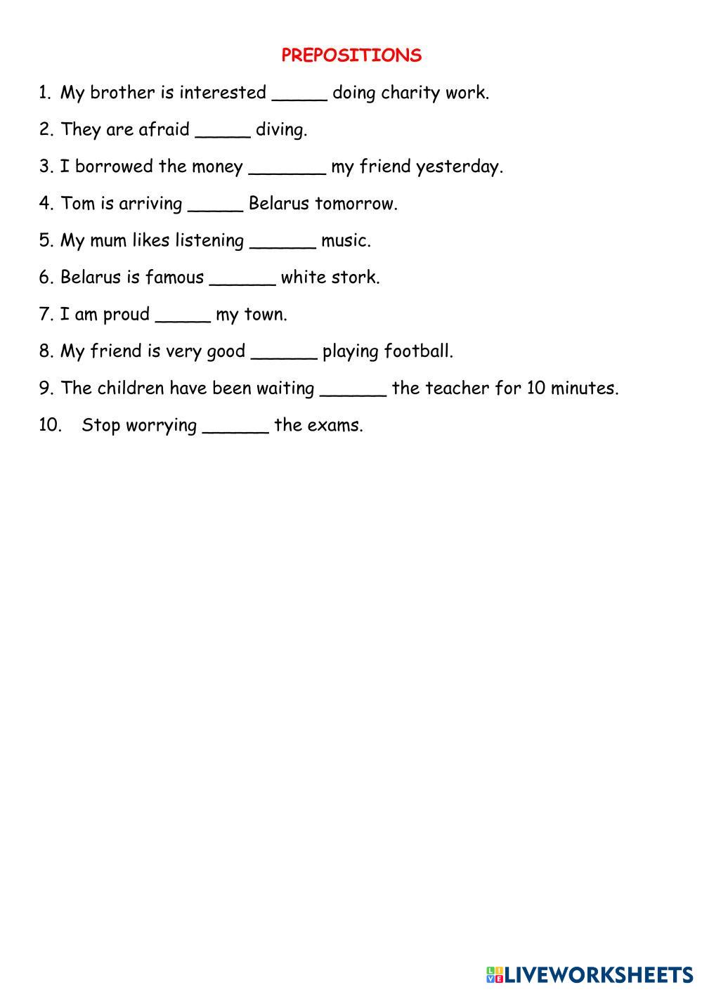 Created by Mika_tima English as a Second Language (ESL) Prepositions Age 10+ level: 8 English Author's Instructions My Google Classroom Courses × 0 classes selected (0 students total) Quick Access Select all classes (0 classes) All Classes Loading courses... Cancel Share Share to selected Course __COURSE_NAME__ __STUDENT_NAME__ (__STUDENT_EMAIL__) Prepositions F8 U4 Download Worksheet Validation Check my answers Emails my answers to my teacher Full name Group/level School subject Teacher's email or key code Close Submit Validating worksheet... (12) Your answers have been sent to your teacher. Good luck! OK We encountered an error submitting your answers. Please try again. OK Advertisement | Go Ad Free Created by Mika_tima English as a Second Language (ESL) Prepositions Age 10+ level: 8 English Author's Instructions
