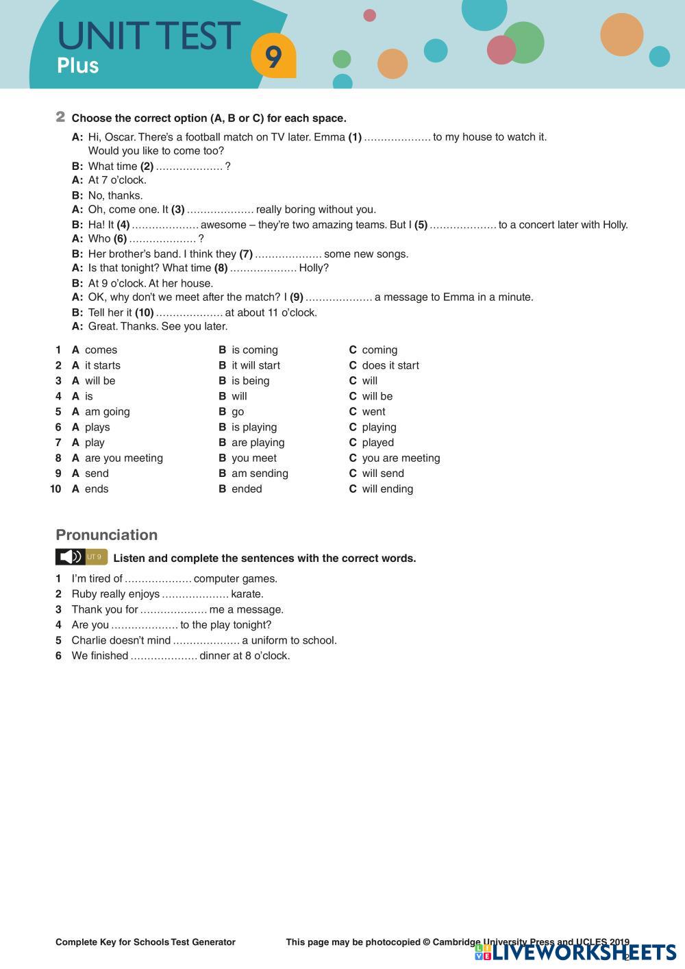 Created byNguyễn Hoàng Hải Vân English as a Second Language (ESL) Tests and exams Age 11-18 level: Grade 6-9 English Author's Instructions My Google Classroom Courses × 0 classes selected (0 students total) Quick Access Select all classes (0 classes) All Classes Loading courses... Cancel Share Share to selected Course __COURSE_NAME__ __STUDENT_NAME__ (__STUDENT_EMAIL__) KET Unit Test 9 Download Worksheet Validation Check my answers Emails my answers to my teacher Full name Group/level School subject Teacher's email or key code Close Submit Validating worksheet... (12) Your answers have been sent to your teacher. Good luck! OK We encountered an error submitting your answers. Please try again. OK Advertisement | Go Ad Free Created byNguyễn Hoàng Hải Vân English as a Second Language (ESL) Tests and exams Age 11-18 level: Grade 6-9 English Author's Instructions