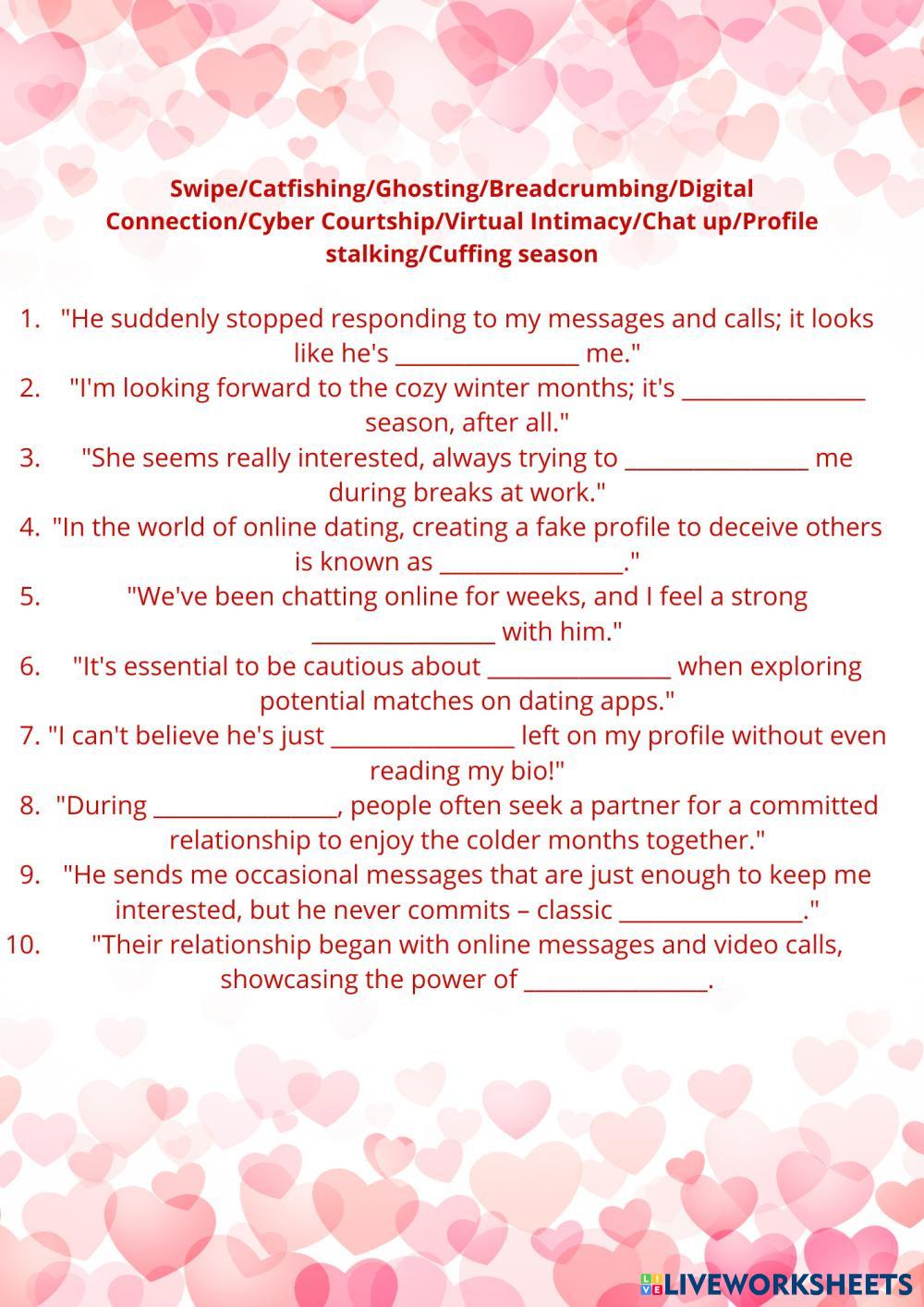 Created by romantsova English as a Second Language (ESL) Online dating Age 17+ level: B1 English Author's Instructions My Google Classroom Courses × 0 classes selected (0 students total) Quick Access Select all classes (0 classes) All Classes Loading courses... Cancel Share Share to selected Course __COURSE_NAME__ __STUDENT_NAME__ (__STUDENT_EMAIL__) ST Valentine's Day Download Worksheet Validation Check my answers Emails my answers to my teacher Full name Group/level School subject Teacher's email or key code Close Submit Validating worksheet... (12) Your answers have been sent to your teacher. Good luck! OK We encountered an error submitting your answers. Please try again. OK Advertisement | Go Ad Free Created by romantsova English as a Second Language (ESL) Online dating Age 17+ level: B1 English Author's Instructions