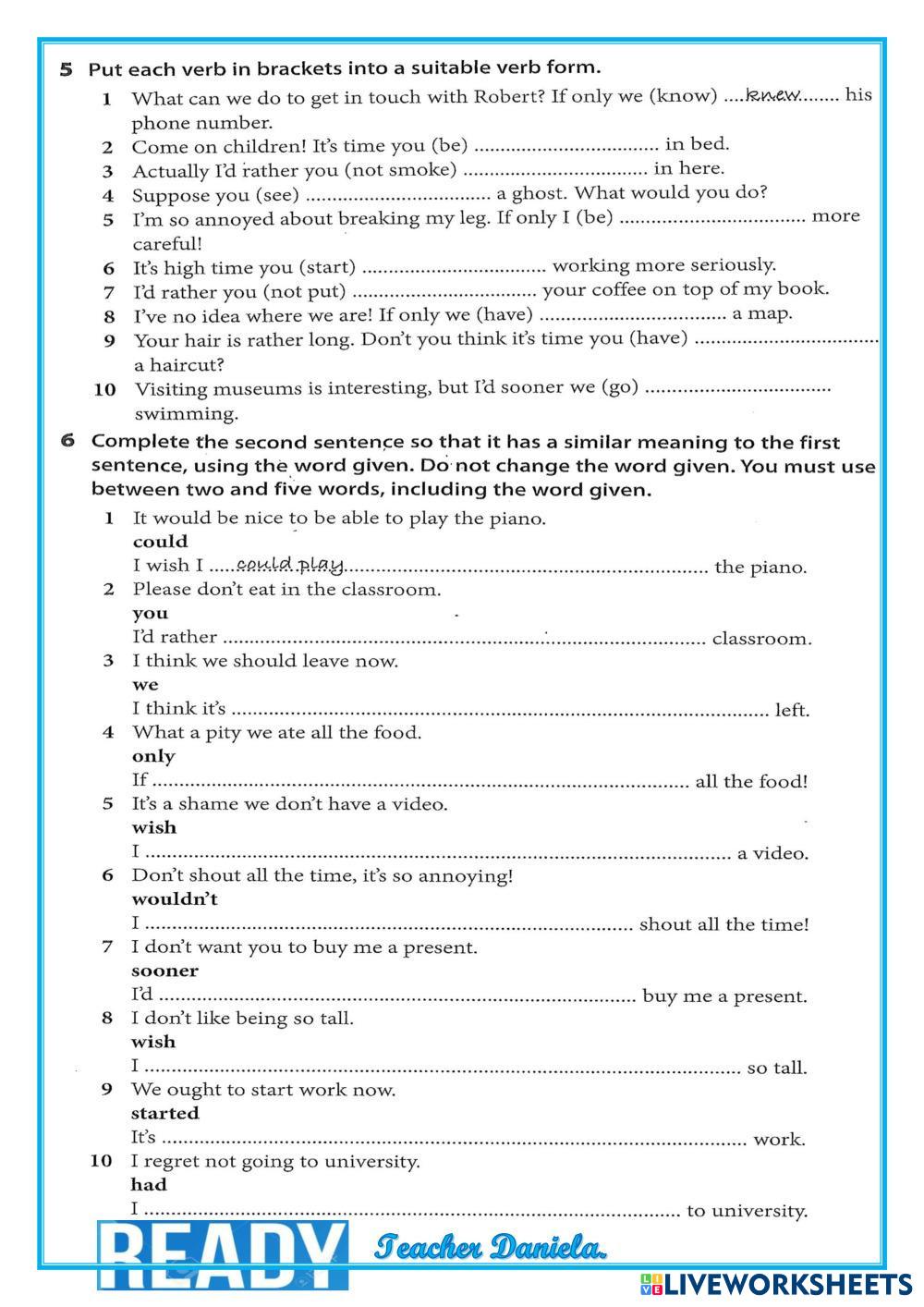 Created byDaniela Reinhardt English as a Second Language (ESL) Wish and If only Age 15+ level: Upper-Intermediate English Author's Instructions My Google Classroom Courses × 0 classes selected (0 students total) Quick Access Select all classes (0 classes) All Classes Loading courses... Cancel Share Share to selected Course __COURSE_NAME__ __STUDENT_NAME__ (__STUDENT_EMAIL__) Unit 11 - Wish / If only - MV Download Worksheet Validation Check my answers Emails my answers to my teacher Full name Group/level School subject Teacher's email or key code Close Submit Validating worksheet... (12) Your answers have been sent to your teacher. Good luck! OK We encountered an error submitting your answers. Please try again. OK Advertisement | Go Ad Free Created byDaniela Reinhardt English as a Second Language (ESL) Wish and If only Age 15+ level: Upper-Intermediate English Author's Instructions