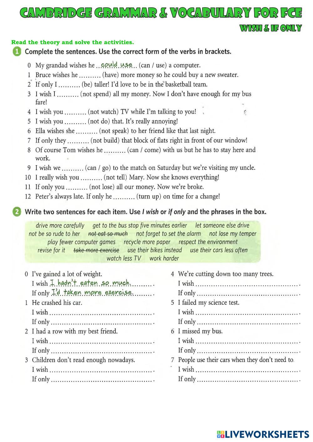 Created byDaniela Reinhardt English as a Second Language (ESL) I wish- If only Age 15+ level: Upper-Intermediate English Author's Instructions My Google Classroom Courses × 0 classes selected (0 students total) Quick Access Select all classes (0 classes) All Classes Loading courses... Cancel Share Share to selected Course __COURSE_NAME__ __STUDENT_NAME__ (__STUDENT_EMAIL__) Unit 11 - Wish / If only - Gr&VocFCE Download Worksheet Validation Check my answers Emails my answers to my teacher Full name Group/level School subject Teacher's email or key code Close Submit Validating worksheet... (12) Your answers have been sent to your teacher. Good luck! OK We encountered an error submitting your answers. Please try again. OK Advertisement | Go Ad Free Created byDaniela Reinhardt English as a Second Language (ESL) I wish- If only Age 15+ level: Upper-Intermediate English Author's Instructions