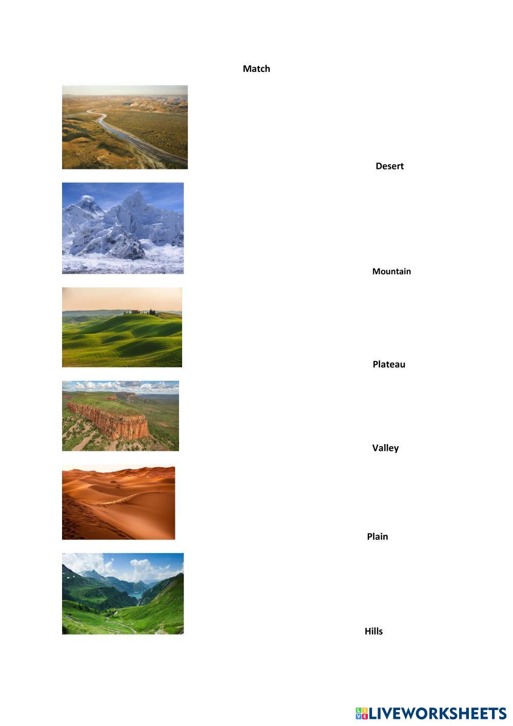 Created byDorji Dema English as a Second Language (ESL) Types of Landforms Age 9-15 level: VII English Author's Instructions Let students match the landforms and its words My Google Classroom Courses × 0 classes selected (0 students total) Quick Access Select all classes (0 classes) All Classes Loading courses... Cancel Share Share to selected Course __COURSE_NAME__ __STUDENT_NAME__ (__STUDENT_EMAIL__) Types of landforms Download Worksheet Validation Check my answers Emails my answers to my teacher Full name Group/level School subject Teacher's email or key code Close Submit Validating worksheet... (12) Your answers have been sent to your teacher. Good luck! OK We encountered an error submitting your answers. Please try again. OK Advertisement | Go Ad Free Created byDorji Dema English as a Second Language (ESL) Types of Landforms Age 9-15 level: VII English Author's Instructions Let students match the landforms and its words