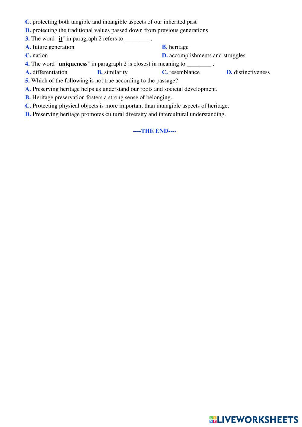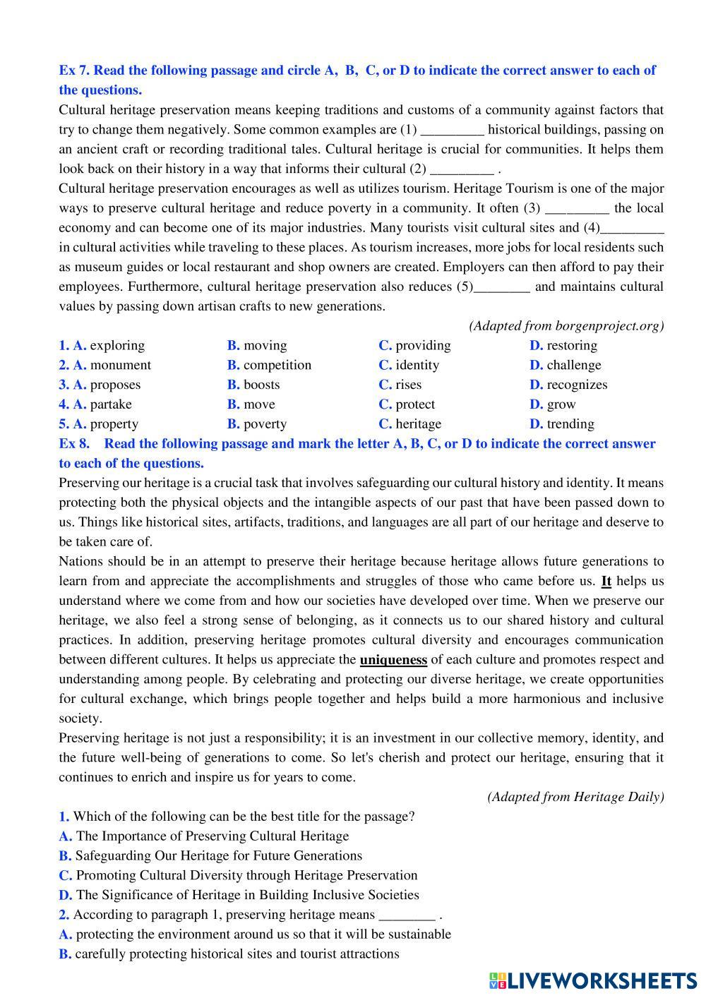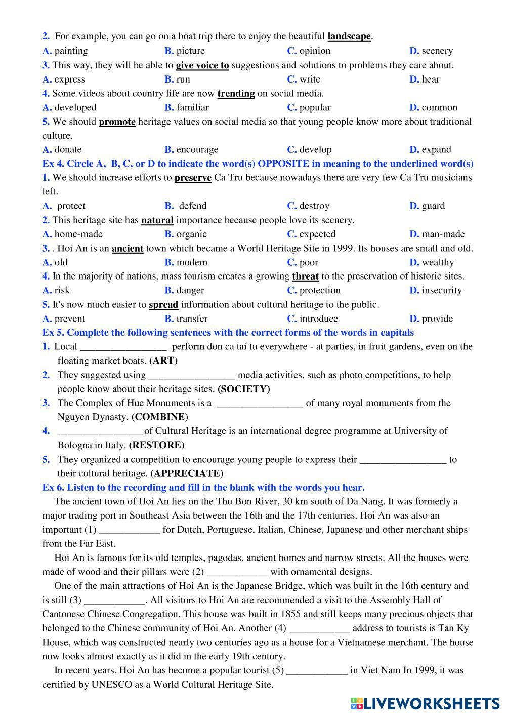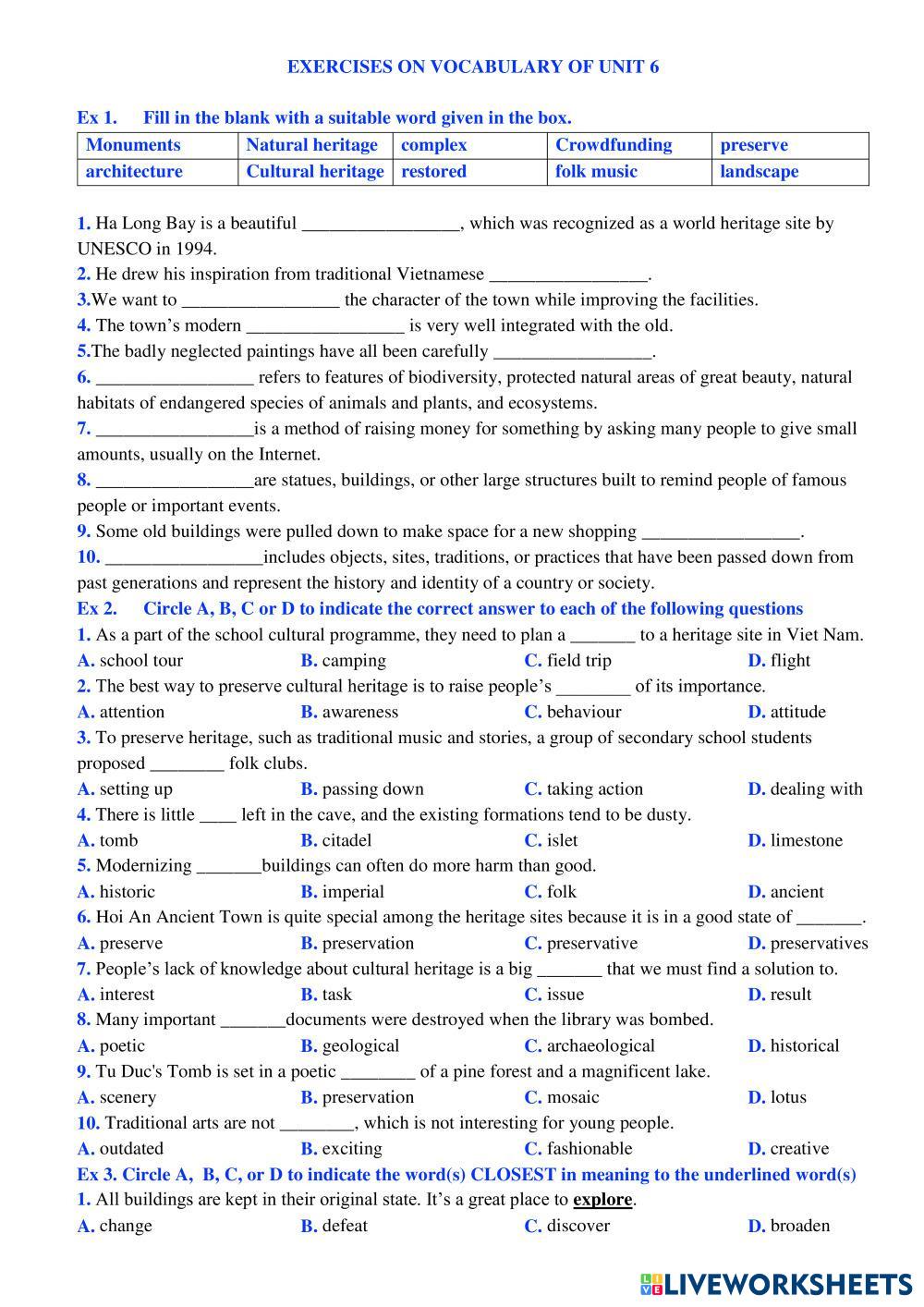 Created byHoàng Thị Thu Hiền English as a Second Language (ESL) Vocab related to preserving heritage Age 16+ level: E11 English Author's Instructions Vocab related to preserving heritage My Google Classroom Courses × 0 classes selected (0 students total) Quick Access Select all classes (0 classes) All Classes Loading courses... Cancel Share Share to selected Course __COURSE_NAME__ __STUDENT_NAME__ (__STUDENT_EMAIL__) UNIT 6. PRESERVING OUR HERITAGE Download Worksheet Validation Check my answers Emails my answers to my teacher Full name Group/level School subject Teacher's email or key code Close Submit Validating worksheet... (12) Your answers have been sent to your teacher. Good luck! OK We encountered an error submitting your answers. Please try again. OK Advertisement | Go Ad Free Created byHoàng Thị Thu Hiền English as a Second Language (ESL) Vocab related to preserving heritage Age 16+ level: E11 English Author's Instructions Vocab related to preserving heritage