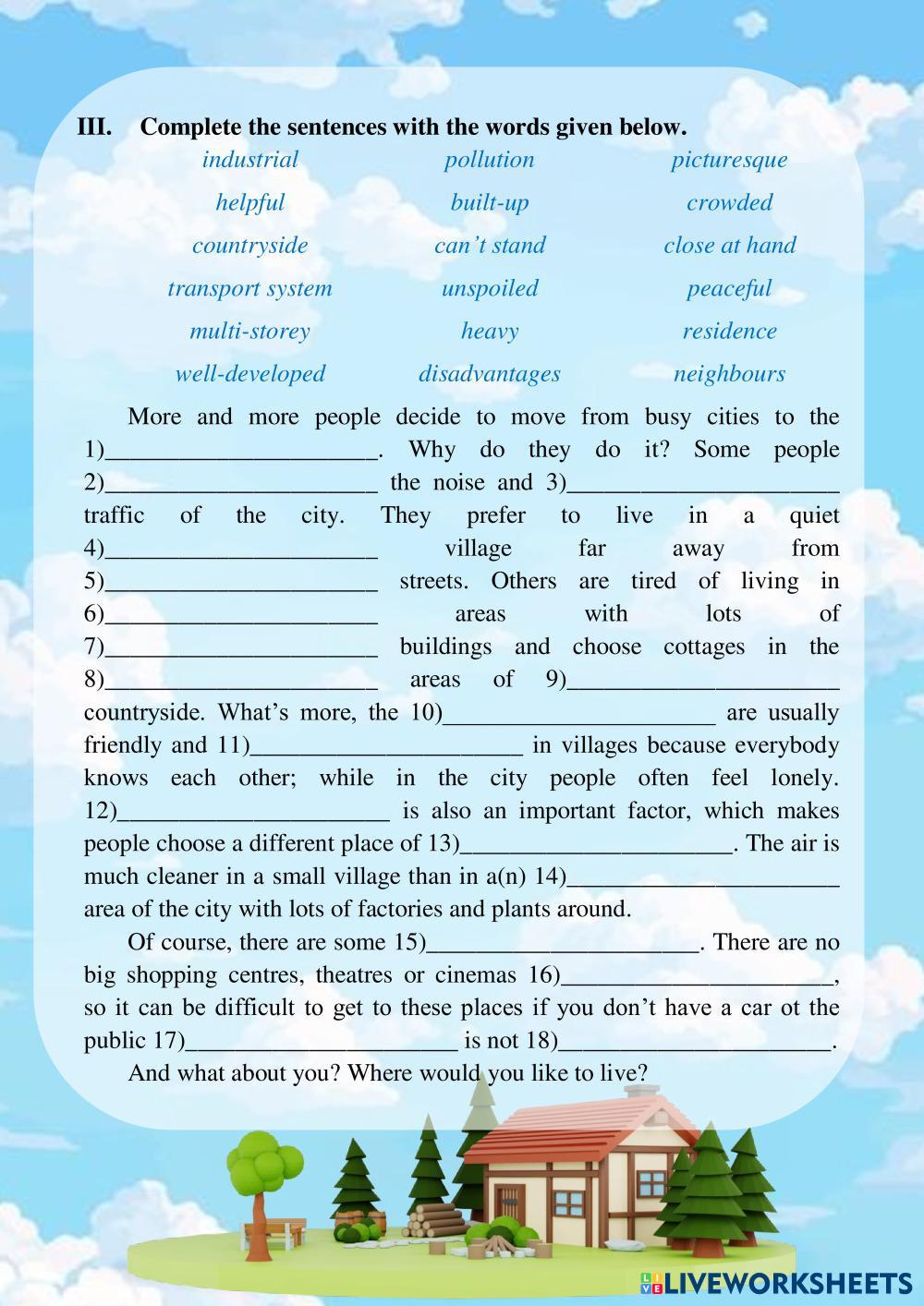 Created by olgamikhalovskaya English as a Second Language (ESL) Vocabulary Age 11+ level: A2 English Author's Instructions My Google Classroom Courses × 0 classes selected (0 students total) Quick Access Select all classes (0 classes) All Classes Loading courses... Cancel Share Share to selected Course __COURSE_NAME__ __STUDENT_NAME__ (__STUDENT_EMAIL__) Form 7 Unit 6 Life in a city of in the countryside? Download Worksheet Validation Check my answers Emails my answers to my teacher Full name Group/level School subject Teacher's email or key code Close Submit Validating worksheet... (12) Your answers have been sent to your teacher. Good luck! OK We encountered an error submitting your answers. Please try again. OK Advertisement | Go Ad Free Created by olgamikhalovskaya English as a Second Language (ESL) Vocabulary Age 11+ level: A2 English Author's Instructions