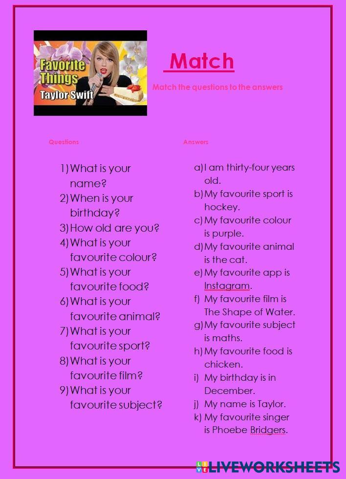 Created byDaiana English as a Second Language (ESL) Personal questions Age 7+ level: A1 English Author's Instructions My Google Classroom Courses × 0 classes selected (0 students total) Quick Access Select all classes (0 classes) All Classes Loading courses... Cancel Share Share to selected Course __COURSE_NAME__ __STUDENT_NAME__ (__STUDENT_EMAIL__) Match Download Worksheet Validation Check my answers Emails my answers to my teacher Full name Group/level School subject Teacher's email or key code Close Submit Validating worksheet... (12) Your answers have been sent to your teacher. Good luck! OK We encountered an error submitting your answers. Please try again. OK Advertisement | Go Ad Free Created byDaiana English as a Second Language (ESL) Personal questions Age 7+ level: A1 English Author's Instructions