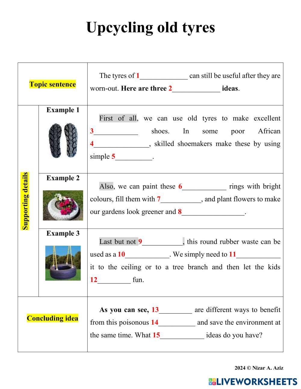 Created byNizar English as a Second Language (ESL) Language Skills Age 10-18 level: A2 English Author's Instructions Upcycling tyres My Google Classroom Courses × 0 classes selected (0 students total) Quick Access Select all classes (0 classes) All Classes Loading courses... Cancel Share Share to selected Course __COURSE_NAME__ __STUDENT_NAME__ (__STUDENT_EMAIL__) Upcycling tyres Download Worksheet Validation Check my answers Emails my answers to my teacher Full name Group/level School subject Teacher's email or key code Close Submit Validating worksheet... (12) Your answers have been sent to your teacher. Good luck! OK We encountered an error submitting your answers. Please try again. OK Advertisement | Go Ad Free Created byNizar English as a Second Language (ESL) Language Skills Age 10-18 level: A2 English Author's Instructions Upcycling tyres