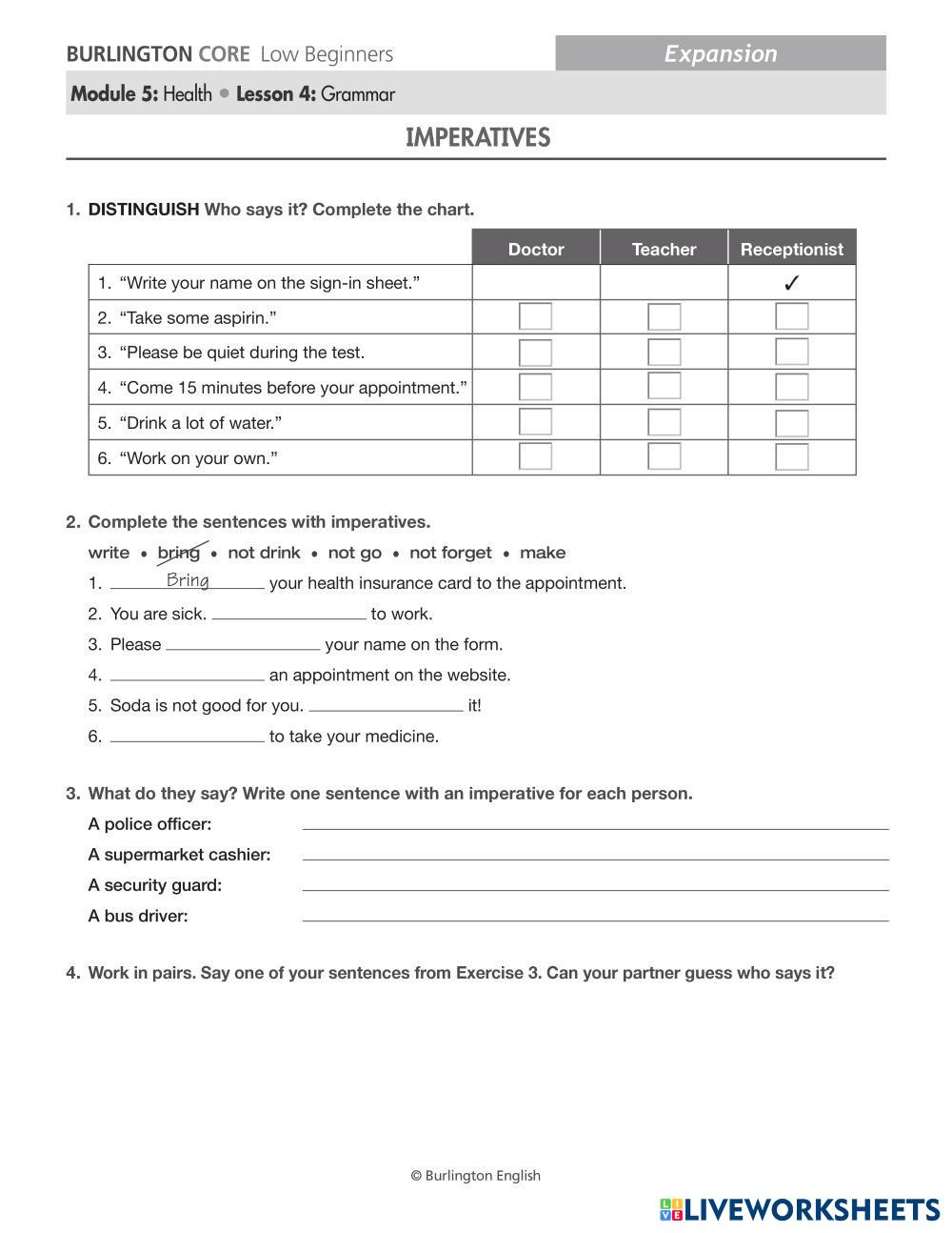 Created byCynthia Faulkner ESOL Imperatives Age 18+ level: Foundation English Author's Instructions My Google Classroom Courses × 0 classes selected (0 students total) Quick Access Select all classes (0 classes) All Classes Loading courses... Cancel Share Share to selected Course __COURSE_NAME__ __STUDENT_NAME__ (__STUDENT_EMAIL__) Imperative BEU5L4 Download Worksheet Validation Check my answers Emails my answers to my teacher Full name Group/level School subject Teacher's email or key code Close Submit Validating worksheet... (12) Your answers have been sent to your teacher. Good luck! OK We encountered an error submitting your answers. Please try again. OK Advertisement | Go Ad Free Created byCynthia Faulkner ESOL Imperatives Age 18+ level: Foundation English Author's Instructions