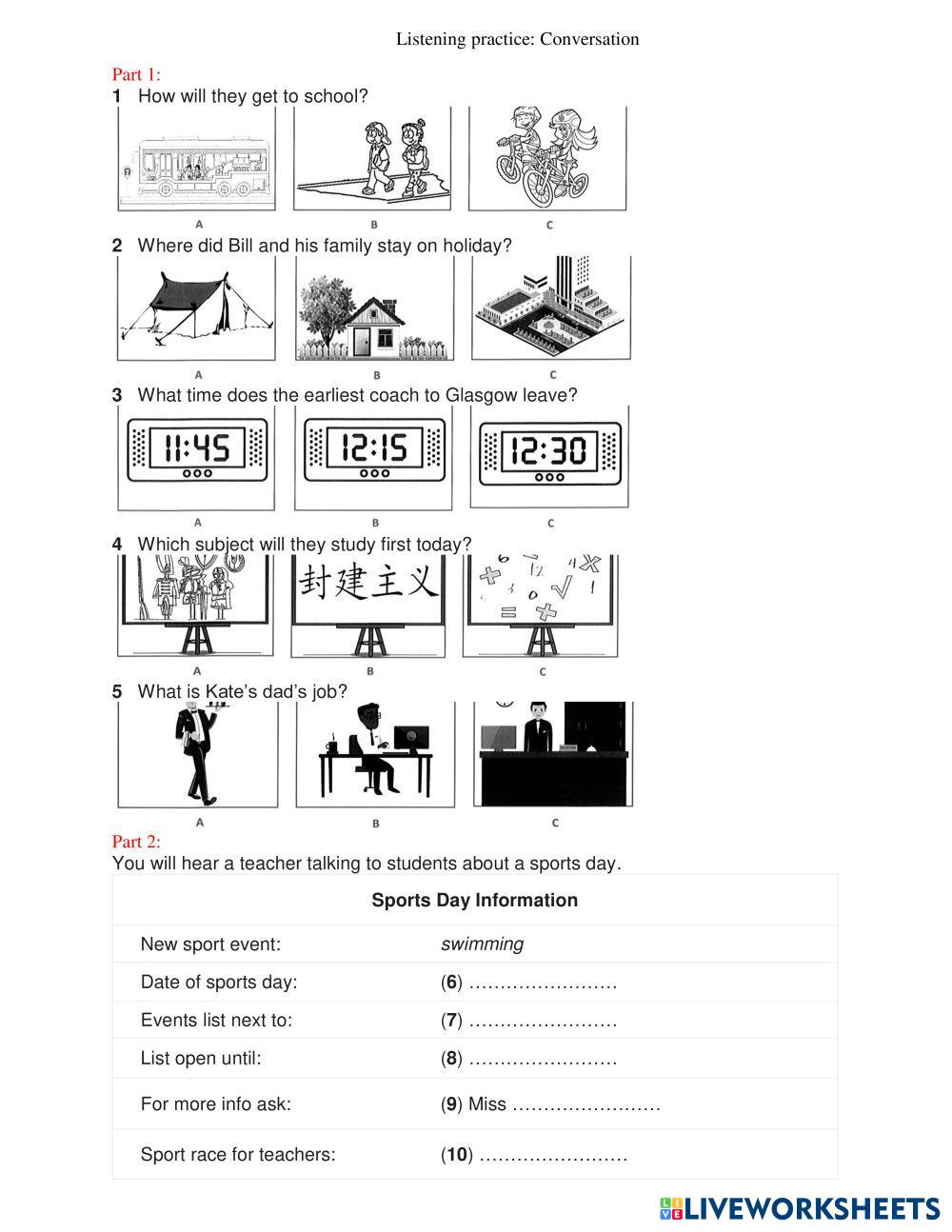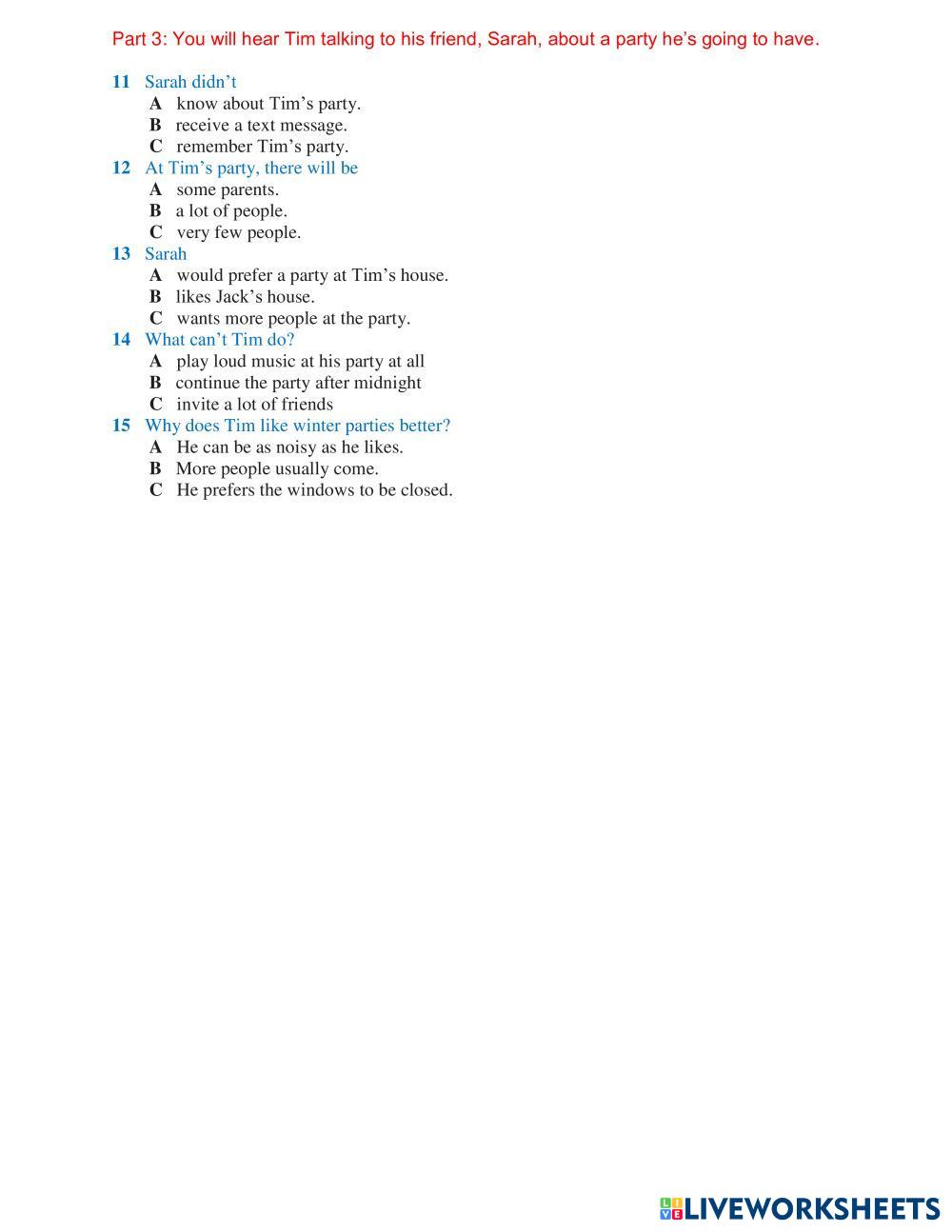 Created byNguyen thi Thanh Thuy English as a Second Language (ESL) Listening comprehension Age 12+ level: A2 English Author's Instructions My Google Classroom Courses × 0 classes selected (0 students total) Quick Access Select all classes (0 classes) All Classes Loading courses... Cancel Share Share to selected Course __COURSE_NAME__ __STUDENT_NAME__ (__STUDENT_EMAIL__) KET PRACTICE Download Worksheet Validation Check my answers Emails my answers to my teacher Full name Group/level School subject Teacher's email or key code Close Submit Validating worksheet... (12) Your answers have been sent to your teacher. Good luck! OK We encountered an error submitting your answers. Please try again. OK Advertisement | Go Ad Free Created byNguyen thi Thanh Thuy English as a Second Language (ESL) Listening comprehension Age 12+ level: A2 English Author's Instructions