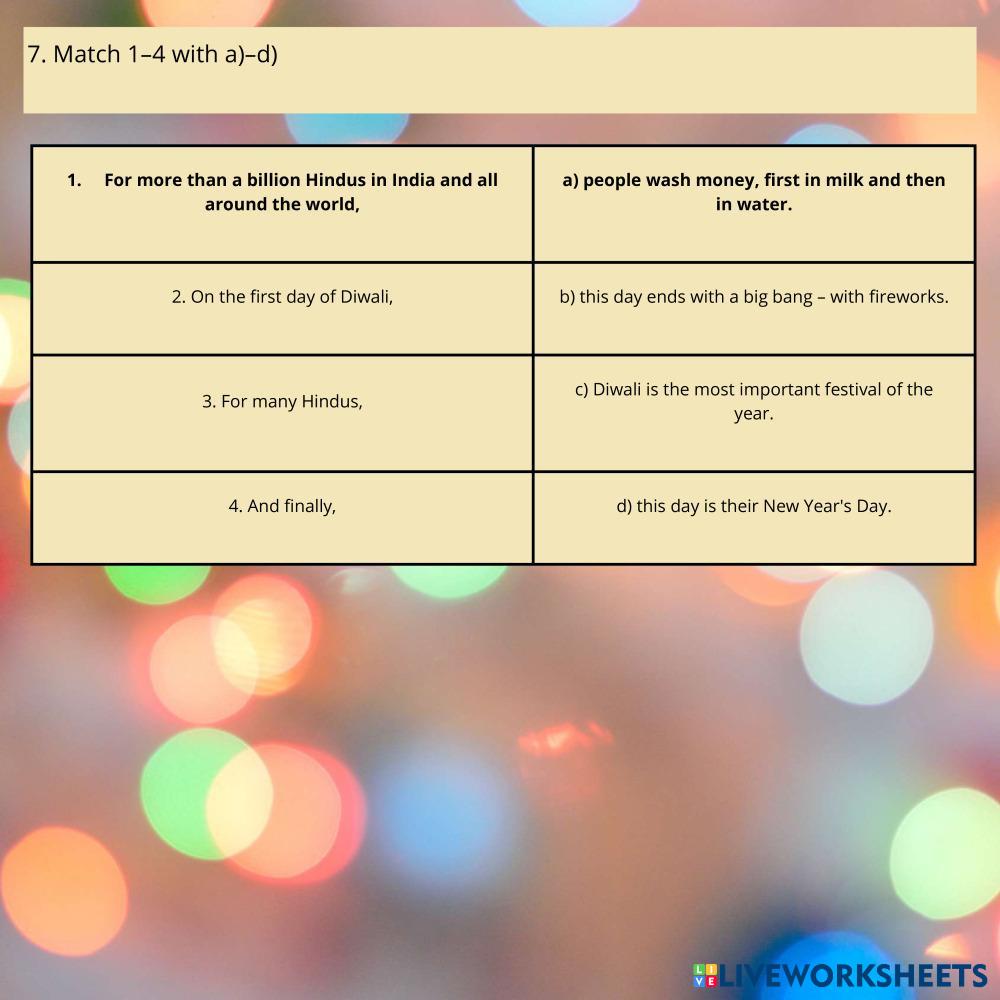 Created byTatsiana English as a Second Language (ESL) India Age 10+ level: 1-2 English Author's Instructions My Google Classroom Courses × 0 classes selected (0 students total) Quick Access Select all classes (0 classes) All Classes Loading courses... Cancel Share Share to selected Course __COURSE_NAME__ __STUDENT_NAME__ (__STUDENT_EMAIL__) My diwali Download Worksheet Validation Check my answers Emails my answers to my teacher Full name Group/level School subject Teacher's email or key code Close Submit Validating worksheet... (12) Your answers have been sent to your teacher. Good luck! OK We encountered an error submitting your answers. Please try again. OK Advertisement | Go Ad Free Created byTatsiana English as a Second Language (ESL) India Age 10+ level: 1-2 English Author's Instructions