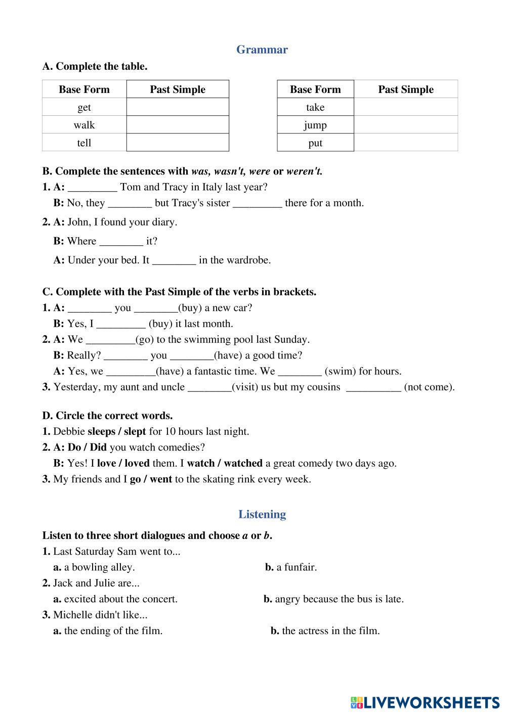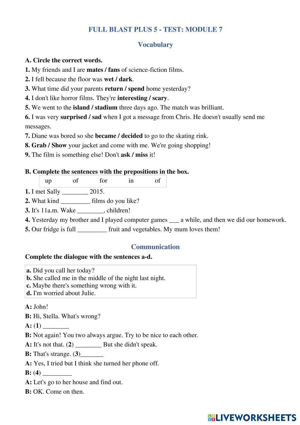 Created byMaryna Nezhyva English as a Second Language (ESL) Tests and exams Age 10-15 level: 2-3 English Author's Instructions past simple reading listening writing vocabulary communication My Google Classroom Courses × 0 classes selected (0 students total) Quick Access Select all classes (0 classes) All Classes Loading courses... Cancel Share Share to selected Course __COURSE_NAME__ __STUDENT_NAME__ (__STUDENT_EMAIL__) FULL BLAST PLUS 5 - TEST: MODULE 7 Download Worksheet Validation Check my answers Emails my answers to my teacher Full name Group/level School subject Teacher's email or key code Close Submit Validating worksheet... (12) Your answers have been sent to your teacher. Good luck! OK We encountered an error submitting your answers. Please try again. OK Advertisement | Go Ad Free Created byMaryna Nezhyva English as a Second Language (ESL) Tests and exams Age 10-15 level: 2-3 English Author's Instructions past simple reading listening writing vocabulary communication