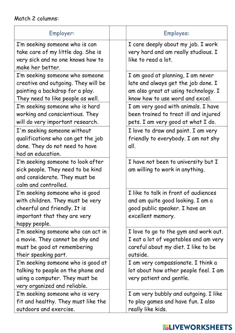 Created by tinkuzza English as a Second Language (ESL) Vocabulary Age 13+ level: 9 English Author's Instructions My Google Classroom Courses × 0 classes selected (0 students total) Quick Access Select all classes (0 classes) All Classes Loading courses... Cancel Share Share to selected Course __COURSE_NAME__ __STUDENT_NAME__ (__STUDENT_EMAIL__) Nesvit 9 Jobs Download Worksheet Validation Check my answers Emails my answers to my teacher Full name Group/level School subject Teacher's email or key code Close Submit Validating worksheet... (12) Your answers have been sent to your teacher. Good luck! OK We encountered an error submitting your answers. Please try again. OK Advertisement | Go Ad Free Created by tinkuzza English as a Second Language (ESL) Vocabulary Age 13+ level: 9 English Author's Instructions