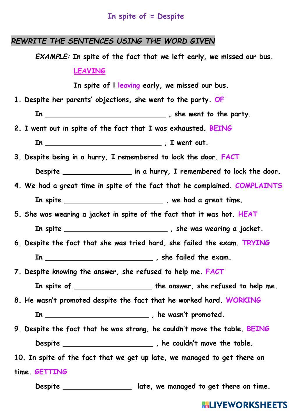 Created by Mika_tima English as a Second Language (ESL) In spite-Despite-Although-exercise Age 10+ level: 9 English Author's Instructions My Google Classroom Courses × 0 classes selected (0 students total) Quick Access Select all classes (0 classes) All Classes Loading courses... Cancel Share Share to selected Course __COURSE_NAME__ __STUDENT_NAME__ (__STUDENT_EMAIL__) In spite of - despite 1f Download Worksheet Validation Check my answers Emails my answers to my teacher Full name Group/level School subject Teacher's email or key code Close Submit Validating worksheet... (12) Your answers have been sent to your teacher. Good luck! OK We encountered an error submitting your answers. Please try again. OK Advertisement | Go Ad Free Created by Mika_tima English as a Second Language (ESL) In spite-Despite-Although-exercise Age 10+ level: 9 English Author's Instructions
