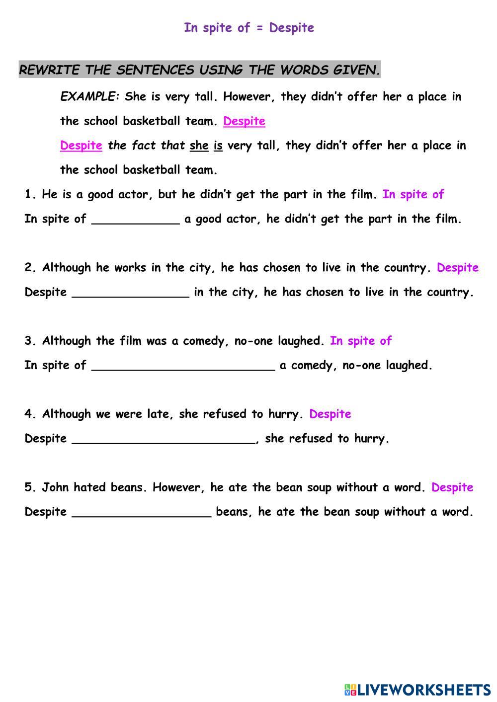 Created by Mika_tima English as a Second Language (ESL) Despite, In spite of Age 10+ level: 10 English Author's Instructions My Google Classroom Courses × 0 classes selected (0 students total) Quick Access Select all classes (0 classes) All Classes Loading courses... Cancel Share Share to selected Course __COURSE_NAME__ __STUDENT_NAME__ (__STUDENT_EMAIL__) In spite of - despite Download Worksheet Validation Check my answers Emails my answers to my teacher Full name Group/level School subject Teacher's email or key code Close Submit Validating worksheet... (12) Your answers have been sent to your teacher. Good luck! OK We encountered an error submitting your answers. Please try again. OK Advertisement | Go Ad Free Created by Mika_tima English as a Second Language (ESL) Despite, In spite of Age 10+ level: 10 English Author's Instructions
