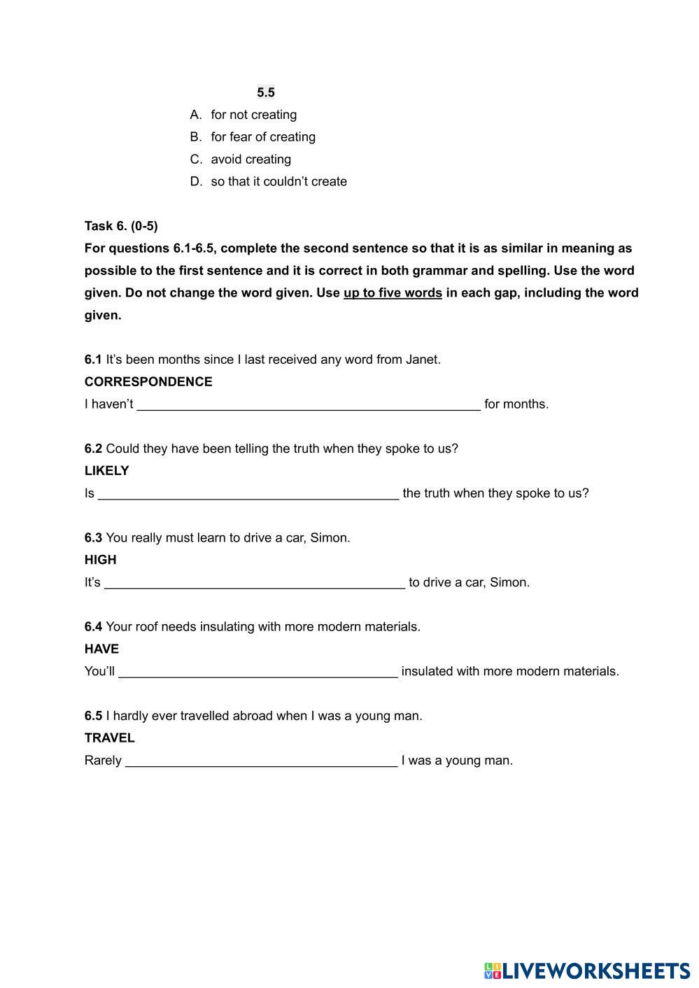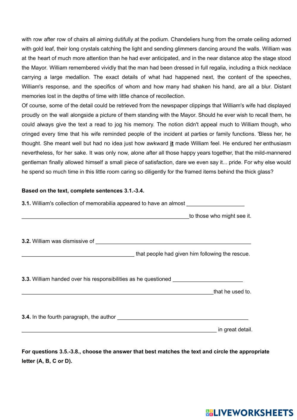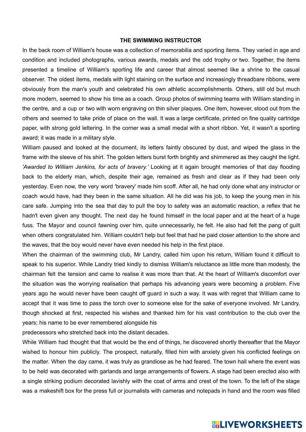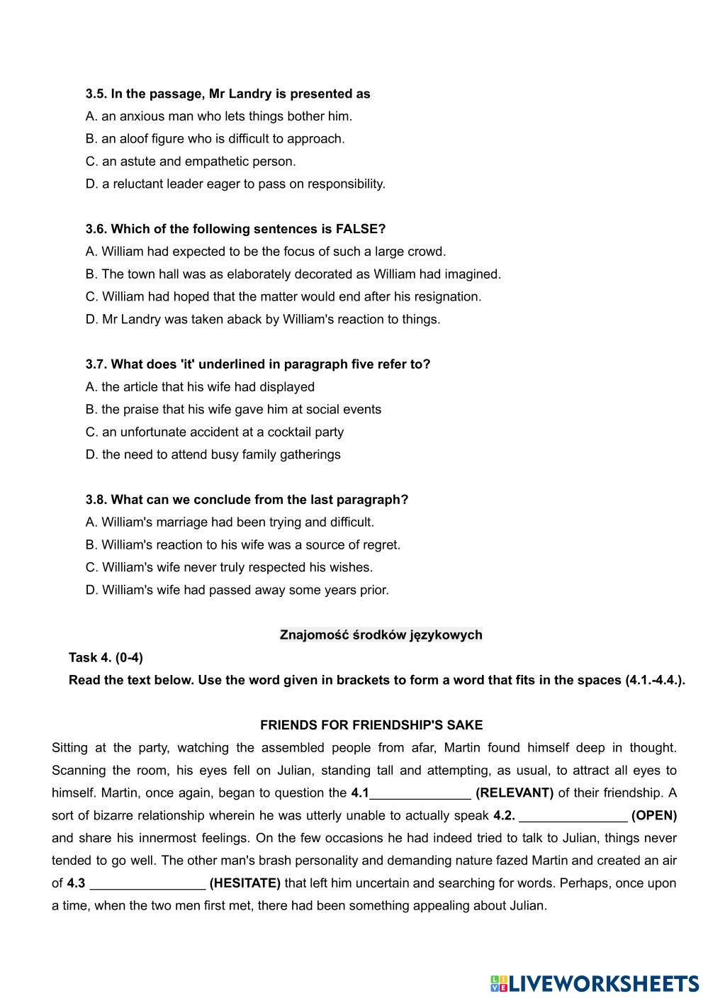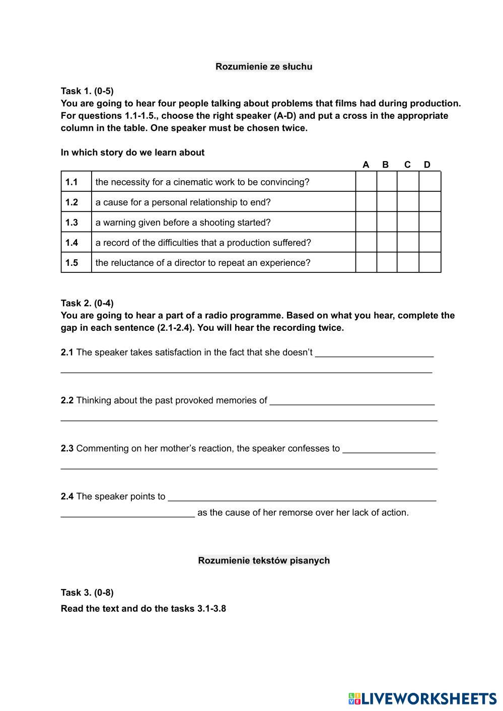 Created by Maddeline79 English as a Second Language (ESL) Listening and reading Age 17+ level: C1-C2 English Author's Instructions My Google Classroom Courses × 0 classes selected (0 students total) Quick Access Select all classes (0 classes) All Classes Loading courses... Cancel Share Share to selected Course __COURSE_NAME__ __STUDENT_NAME__ (__STUDENT_EMAIL__) Matura poziom dwujęzyczny Download Worksheet Validation Check my answers Emails my answers to my teacher Full name Group/level School subject Teacher's email or key code Close Submit Validating worksheet... (12) Your answers have been sent to your teacher. Good luck! OK We encountered an error submitting your answers. Please try again. OK Advertisement | Go Ad Free Created by Maddeline79 English as a Second Language (ESL) Listening and reading Age 17+ level: C1-C2 English Author's Instructions