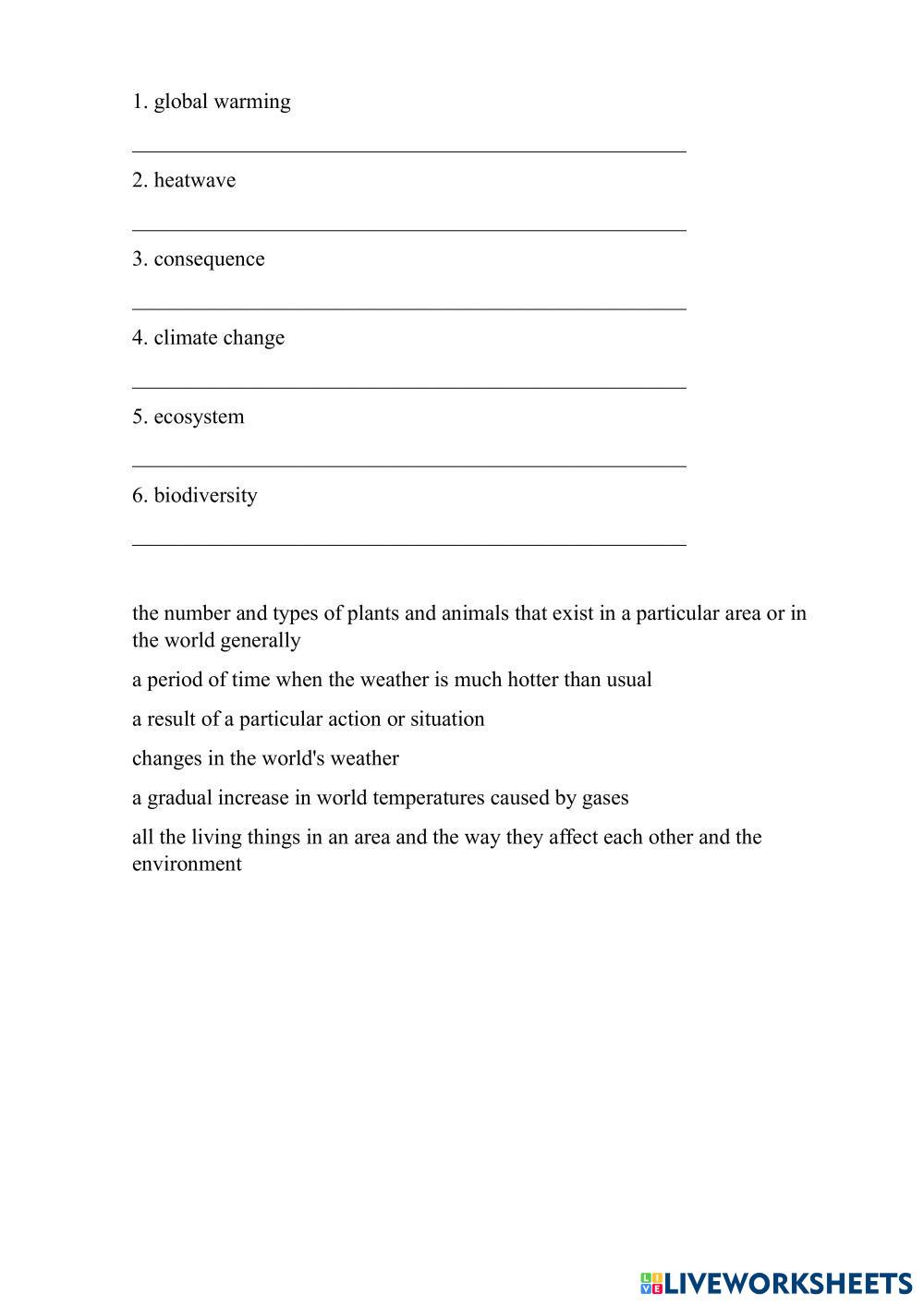 Created byNgoc Do English as a Second Language (ESL) Environmental problems Age 16+ level: B1 English Author's Instructions My Google Classroom Courses × 0 classes selected (0 students total) Quick Access Select all classes (0 classes) All Classes Loading courses... Cancel Share Share to selected Course __COURSE_NAME__ __STUDENT_NAME__ (__STUDENT_EMAIL__) Vocabulary Download Worksheet Validation Check my answers Emails my answers to my teacher Full name Group/level School subject Teacher's email or key code Close Submit Validating worksheet... (12) Your answers have been sent to your teacher. Good luck! OK We encountered an error submitting your answers. Please try again. OK Advertisement | Go Ad Free Created byNgoc Do English as a Second Language (ESL) Environmental problems Age 16+ level: B1 English Author's Instructions