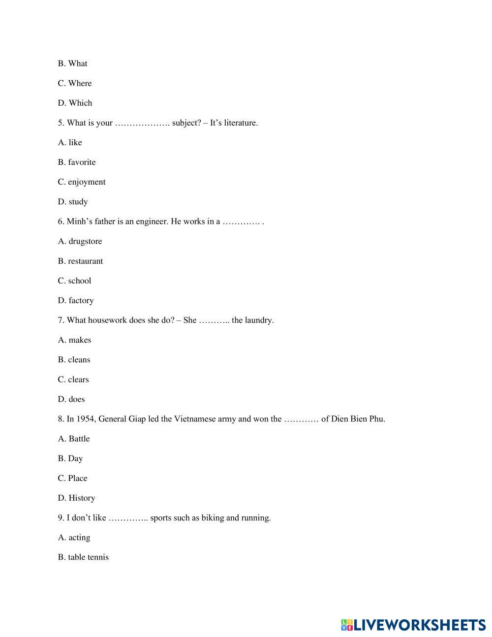 Created byNguyễn Hữu Quang English as a Second Language (ESL) Final test Age 12+ level: 6 grader English Author's Instructions My Google Classroom Courses × 0 classes selected (0 students total) Quick Access Select all classes (0 classes) All Classes Loading courses... Cancel Share Share to selected Course __COURSE_NAME__ __STUDENT_NAME__ (__STUDENT_EMAIL__) Kiểm tra thử_2 Download Worksheet Validation Check my answers Emails my answers to my teacher Full name Group/level School subject Teacher's email or key code Close Submit Validating worksheet... (12) Your answers have been sent to your teacher. Good luck! OK We encountered an error submitting your answers. Please try again. OK Advertisement | Go Ad Free Created byNguyễn Hữu Quang English as a Second Language (ESL) Final test Age 12+ level: 6 grader English Author's Instructions