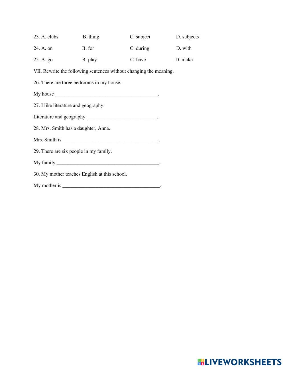Created byNguyễn Hữu Quang English as a Second Language (ESL) Final test Age 12+ level: 6 grader English Author's Instructions My Google Classroom Courses × 0 classes selected (0 students total) Quick Access Select all classes (0 classes) All Classes Loading courses... Cancel Share Share to selected Course __COURSE_NAME__ __STUDENT_NAME__ (__STUDENT_EMAIL__) Kiểm tra thử_3 Download Worksheet Validation Check my answers Emails my answers to my teacher Full name Group/level School subject Teacher's email or key code Close Submit Validating worksheet... (12) Your answers have been sent to your teacher. Good luck! OK We encountered an error submitting your answers. Please try again. OK Advertisement | Go Ad Free Created byNguyễn Hữu Quang English as a Second Language (ESL) Final test Age 12+ level: 6 grader English Author's Instructions
