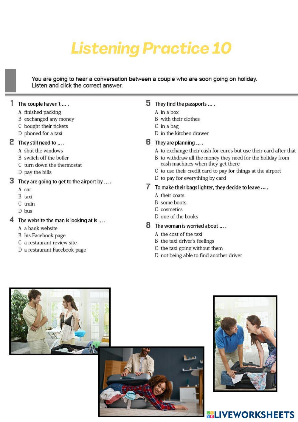 Created byAna María González English as a Second Language (ESL) Listening and vocabulary Age 12+ level: intermediate English Author's Instructions My Google Classroom Courses × 0 classes selected (0 students total) Quick Access Select all classes (0 classes) All Classes Loading courses... Cancel Share Share to selected Course __COURSE_NAME__ __STUDENT_NAME__ (__STUDENT_EMAIL__) Listening practice 10 Download Worksheet Validation Check my answers Emails my answers to my teacher Full name Group/level School subject Teacher's email or key code Close Submit Validating worksheet... (12) Your answers have been sent to your teacher. Good luck! OK We encountered an error submitting your answers. Please try again. OK Advertisement | Go Ad Free Created byAna María González English as a Second Language (ESL) Listening and vocabulary Age 12+ level: intermediate English Author's Instructions